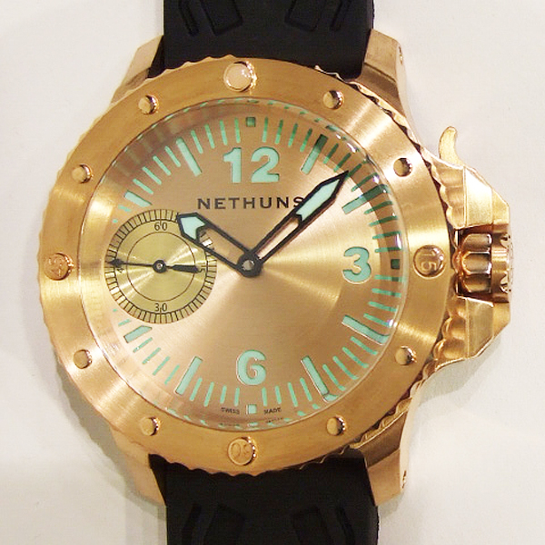 NETHUNS 義大利品牌青銅腕錶/ 型號:5.1.1.7.01/ 採瑞士 Unitas 6497-1 手上鏈機芯/ 機芯為:17石ˋ動力儲存:46小時/ 具時ˋ分ˋ秒指示/ 青銅色三明治面盤/ 阿拉伯數字及標誌線時標/ 青銅色指針(具夜光效果)/ 可單向旋轉潛水外圈,可計算入水時間/ 特殊錶冠護橋/ 手錶尺寸: 45mm錶徑/ 防炫藍寶石水晶玻璃鏡面/ 霧面鈦合金錶底蓋,厚:3.7mm/ 搭配 24mm 原廠黑色橡膠錶帶及咖啡色鯊魚皮錶帶方便更換/ ㄇ字型青銅質錶扣/ 防水: 300米. |