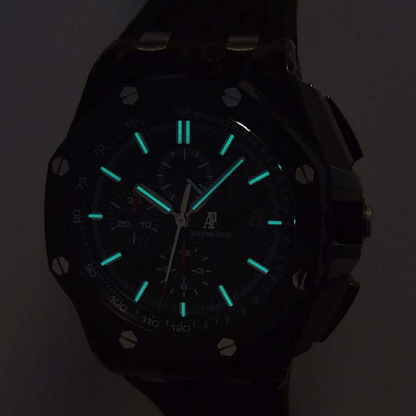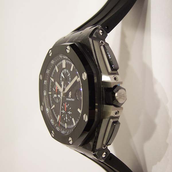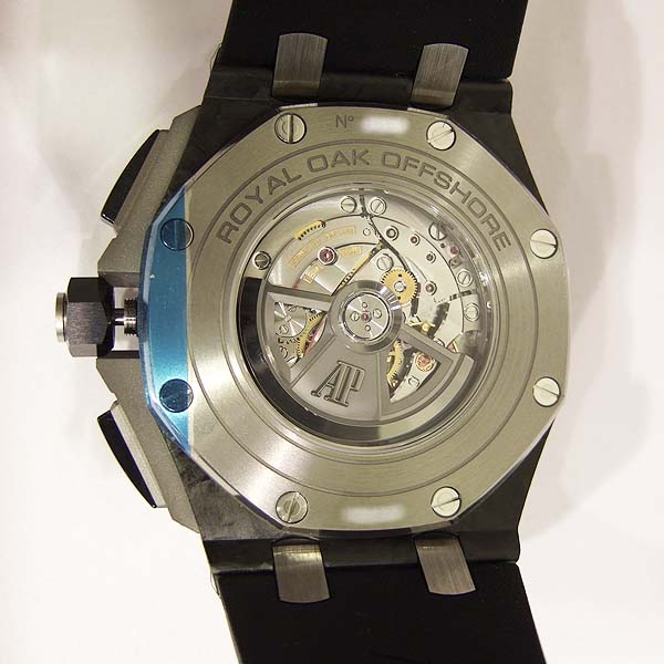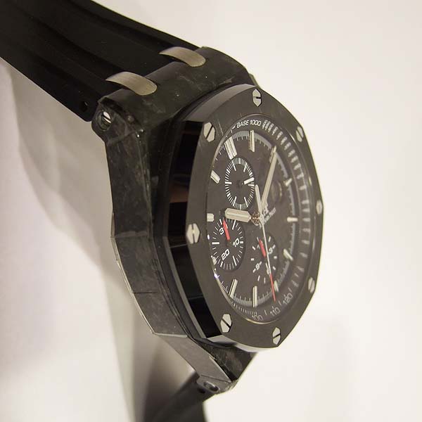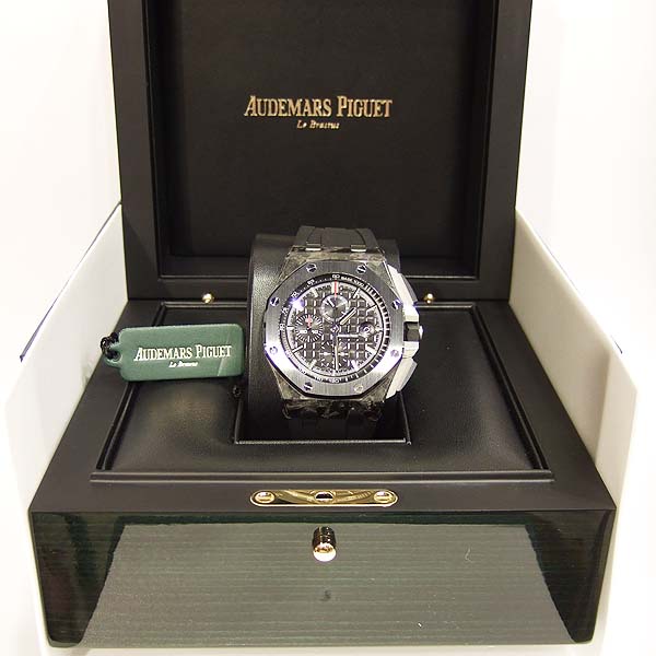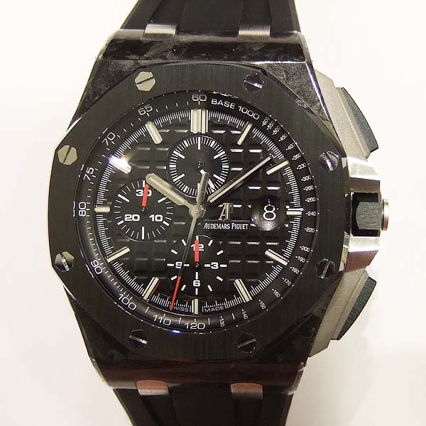 Royal Oak Offshore 皇家橡樹離岸型計時碼錶/ 型號:26400AU.OO.A002CA.01/ 採自動上鏈機芯,機芯為:自製編號: 3126/3840 機芯,22K金雕花自動盤,49顆紅寶石,鍍銠機芯有魚鱗紋及日內瓦波紋打磨,五方位調校,KIF避振裝置,砝碼補償擺輪,扁平式合金游絲/ 錶徑:44mm/ 具時ˋ分ˋ小秒針及日期顯示/ 計時碼錶功能/ 黑色格紋面盤/ 銀色時標及指針/ 黑色內圈有速率標示/ 鍛造碳錶殼/ 鈦合金底蓋/ 黑色陶瓷錶框及計時碼錶按鈕/ 旋入式錶冠/ 藍寶石水晶玻璃及透明底蓋/ 防水100米/ 搭配原廠黑色橡膠錶帶及鈦合金穿扣(一般扣). |