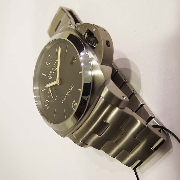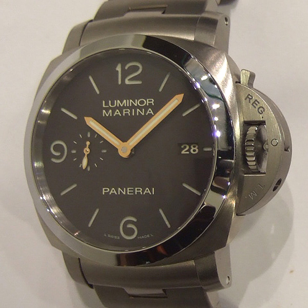 Luminor 1950 Marina 3 Day 自動腕錶/ 型號:PAM-00352/ R 字頭限量 500 只/採用 Panerai P.9000 自動上鏈機芯/ 機芯為:13 3/4 法分ˋ 28石ˋ 每小時擺率 28800次ˋ Incabloc防震裝置ˋ 動力儲存 3 日/ 具時ˋ分ˋ小秒針ˋ日期顯示/ 錶殼44mm 鈦合金材質/ 菸草色錶面(三明治錶盤)/ 夜光時標及指針/ 藍寶石水晶鏡面/ 防水達300米/ 附原廠鈦合金鏈帶及折疊式錶扣.
