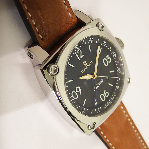 Aviation Dual Time Premium/ 型號:106-0501 / 採瑞士 ETA 2893-2 自動上鏈機芯/ 機芯為:25石,動力儲存:42小時/ 具時ˋ分ˋ秒指示/ 4~5點間日期視窗/ 黑色面盤/ 阿拉伯數字及標誌線時標/ 金色邊夜光指針/ 手錶尺寸: 44mm 錶徑,厚:14.8mm,重:140克/ 藍寶石水晶玻璃/ 透明錶底蓋/ 搭配 24mm 原皮色皮錶帶/ ㄇ字型鋼質錶扣/ 防水: 30米. |