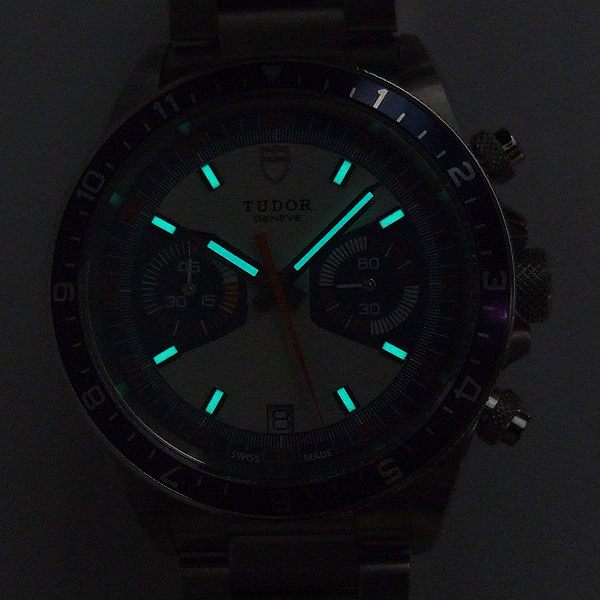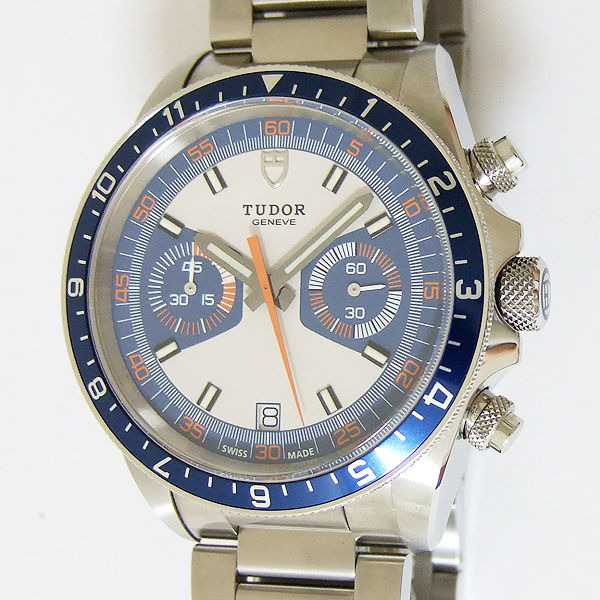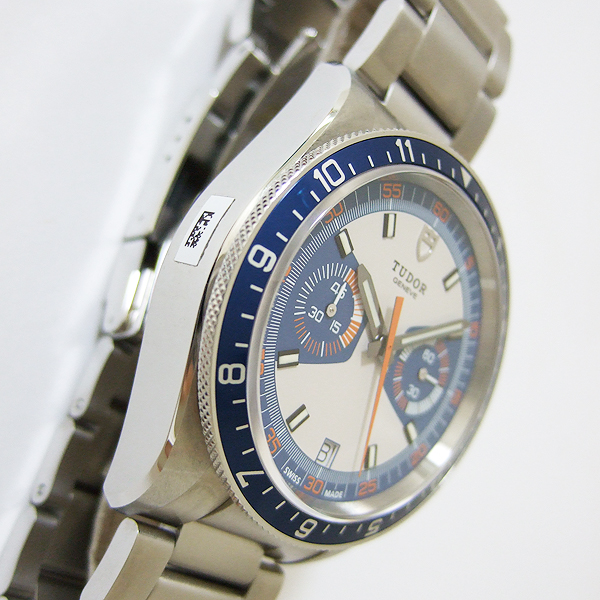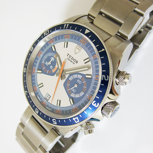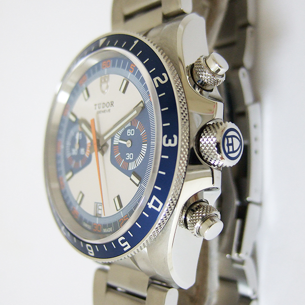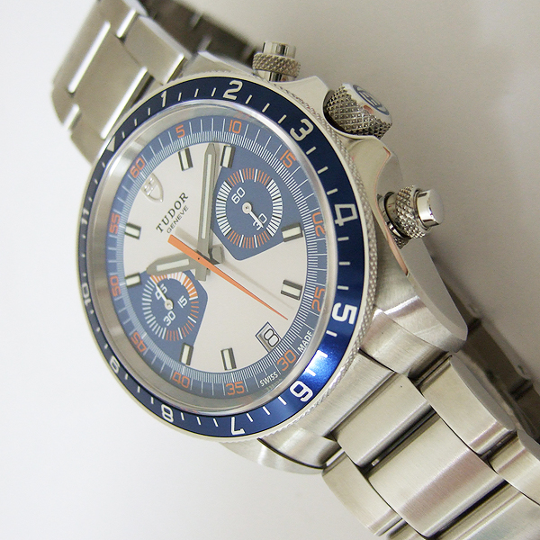 計時碼錶/ 型號: 108-0632 / 採自動上鏈機芯/ 具時ˋ分ˋ秒指示/ 計時碼錶功能/ 白色面盤,藍色計時圈/ 銀色立體標誌型時標/ 橘色計時碼錶指針及橘色阿拉伯數字秒數顆度/ 銀色石ˋ分指針(具夜光效果)/ 鋼質霧或亮面處理錶殼/ 旋入式大型錶冠及計時按鈕/ 手錶尺寸: 41mm 錶徑/ 藍寶石水晶玻璃鏡面/ 剛直底蓋/ 搭配 22mm 原廠鋼質鏈錶帶及原廠折疊式錶扣/ 防水:200米.