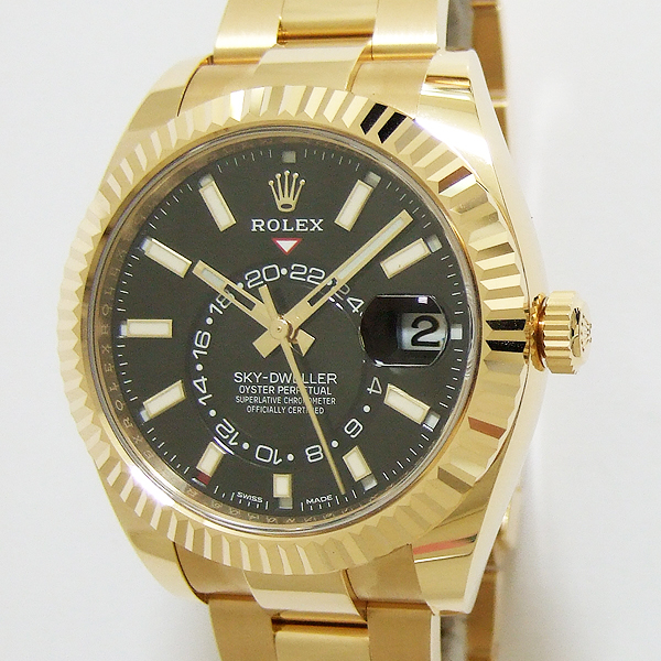 SKY-DWELLER 天行者 18 K黃金年曆腕錶/ 型號:326938/ 亂碼字頭/ 採自動上鏈機芯/ 機芯編號:9001/ 錶徑:42mm/ 具時ˋ分ˋ秒ˋ放大鏡日期顯示,沙羅系統年曆功能,GMT兩地時間時區/ 黑色面盤/ 有防偽刻印錶圈/ 立體夜光時標及指針/ Ring Command 雙向 4 段旋轉18K黃金外圈 /機芯為:鍍銠機芯有魚鱗紋打磨ˋ雙向自動上鏈ˋ動力儲存 70 小時/ 藍寶石水晶玻璃/ 可微調式帶扣// 可深度潛水100米.