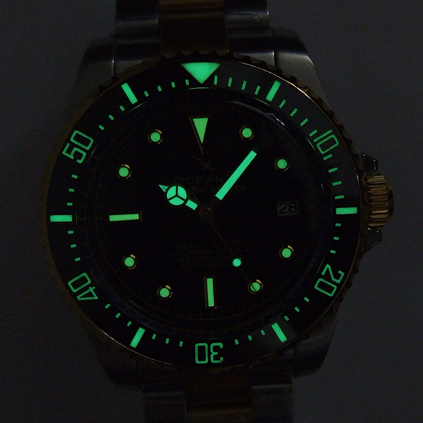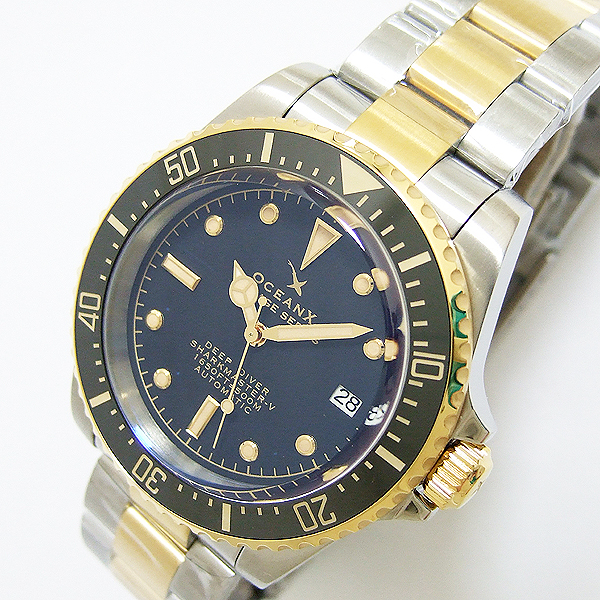 OCEANX 潛水腕錶/ 型號:VSMS561/ 採 SEIKO NH35 自動上鏈機芯,動力儲存約:41小時, 24 顆紅寶石,28800vph/ 黑色錶盤/ 具時ˋ分ˋ秒及 3 點方位日期視窗/ 金色邊框夜光時標及金色標誌線時標/ 可單向旋轉黑色搭配金色數字刻度陶瓷潛水錶圈,可計算入水時間/ 手錶尺寸: 42 mm,厚:15.3mm/ 藍寶石水晶玻璃/ 全錶 316 L 鋼材質,金色部分為不銹鋼電鍍材質 / 搭配原廠鋼質鏈帶及折疊式錶扣/ 防水 500 米. |
