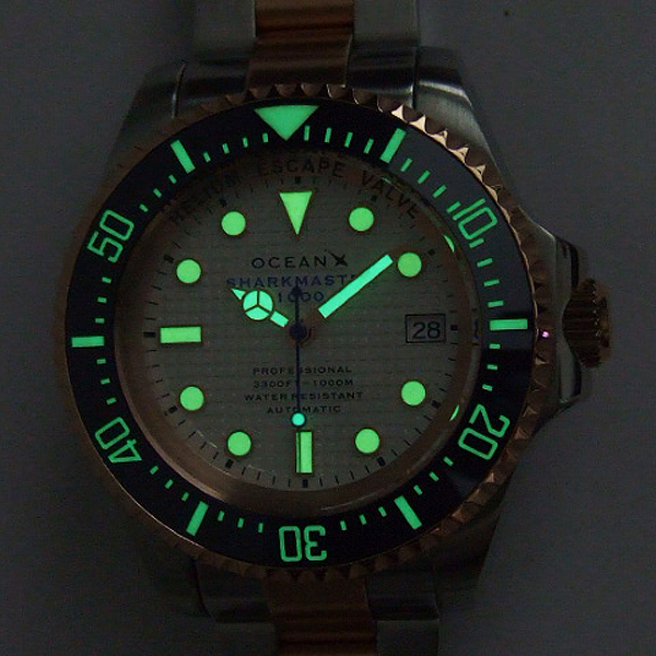 SHARKMASTER 1000 潛水腕錶/ 型號:SMS1053/ 採 SEIKO NH35 自動上鏈機芯,動力儲存約:41小時, 24 顆紅寶石,21600vph/ 白色格紋錶盤/ 具時ˋ分ˋ秒指示,3點方位日期顯示窗/ 夜光立體時標及標誌線時標/ 可單向旋轉藍色陶瓷潛水錶圈,可計算入水時間/ 手錶尺寸: 44 mm,厚:17.1mm/ 藍寶石水晶玻璃/ 全錶 316 L 鋼材質,玫瑰金色部分為PVD發色處理/ 錶殼左側設有排氦氣閥/ 搭配原廠鋼質鏈帶及折疊式錶扣/ 防水 1000 米. |