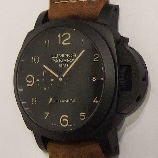 沛納海 Luminor 1950 系列腕錶/ O 字頭限量 1500 只/ 採 Panerai P.9001 自動上鏈機芯, 72 小時動力儲存/ 具時ˋ分ˋ秒指示,第 2 地時間指示 , 3 點方位日期視窗,錶背紅ˋ藍色動力儲存顯示/ 錶殼 44mm 霧面陶瓷材質/ 特殊專利龍頭護橋/ 黑色面盤,夜光指針及時標/ 藍寶石水晶玻璃,具抗反光塗層/ 防水達300米/ 裝配原廠棕色舊化牛皮錶帶及原廠穿扣. |