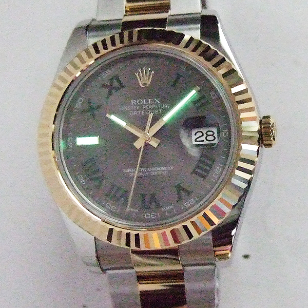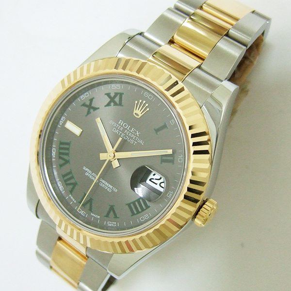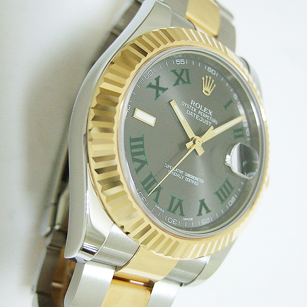 勞力士蠔式 DATEJUST II 腕錶/ 型號:116333/ G 字頭/ 採自動上鏈機芯/ 機芯編號:3136, 採用 PARACHROM游絲的平衡擺輪,四臂環形合金擺輪,四顆微調快慢螺絲,KIF避振裝置,天文台認證(C.O.S.C.),動力儲存 48 小時, 31 石/ 錶徑41mm/ 具時ˋ分ˋ秒針指示及日期放大鏡顯示/ 灰色金屬光面盤搭配綠色羅馬數字刻度/ 夜光指針/ 錶盤內圈刻有一圈防偽 ROLEX 字樣及流水號碼/ 藍寶石水晶玻璃鏡面, 3 點方位設有放大鏡/ 原廠蠔式鏈帶及折疊式錶扣/ 防水達 100 米. |