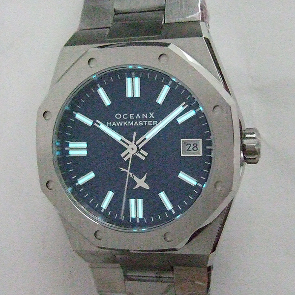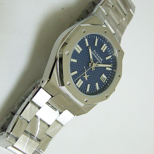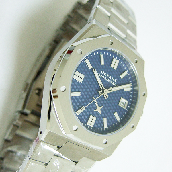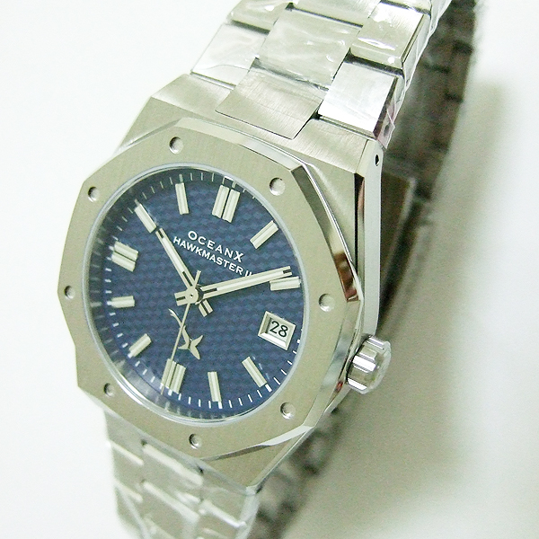 OceanX 腕錶/ 型號:HMS2112 / 採 Miyota 9015 自動上鏈機芯,動力儲存約:42小時, 24 顆紅寶石/ 藍色暗紋錶盤/ 具時ˋ分ˋ秒指示/ 夜光時標及標誌線時標/ 手錶尺寸: 39 mm錶徑,厚:10.89mm/ 藍寶石水晶玻璃/ 全錶 316 L 鋼材質/ 搭配原廠板式鋼質鏈帶及按壓式折疊式錶扣/ 防水 100 米.