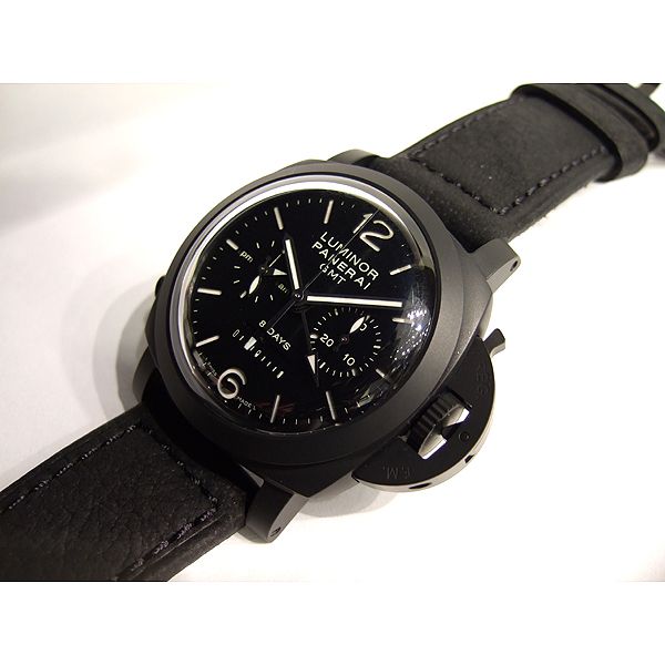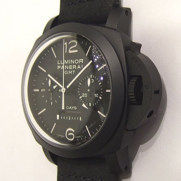 Luminor 1950 Ceramic 8 Days Chrono Monopulsante GMT 腕錶/ 型號:PAM-00317/ L 字頭限量500只/ 採自製P.2004/B 手上鍊機芯,完全由PANERAI研製/ 具時ˋ分ˋ小秒指示/ 12小時制am.pm 第 2 地時區顯示指針/ 30分又60秒計時碼表功能/ 8 天動力儲存橫列式線形顯示(3 個發條盒)/ 錶徑: 44 mm,磨砂錶殼黑色陶磁包覆/ 藍寶石水晶玻璃鏡面及透明後底蓋(可清楚鑑賞機芯黑色塗裝)/ 獨特專利錶冠護橋/ 黑色錶面,夜光時標及6.12阿拉伯數字/ 防水達100米/ 附原廠特殊處理黑色皮革錶帶及黑色膠帶 1 條/ 拆換工具 1 組,方便自行拆換. |