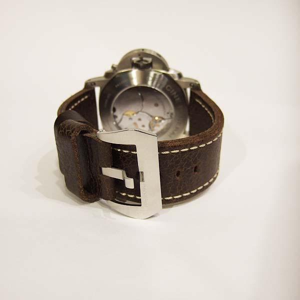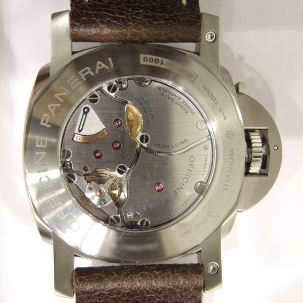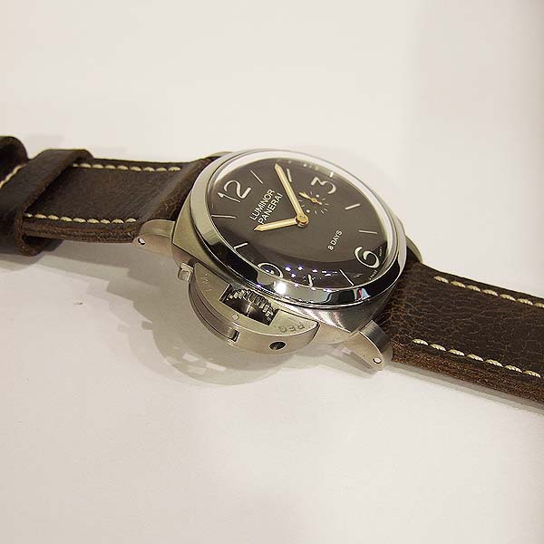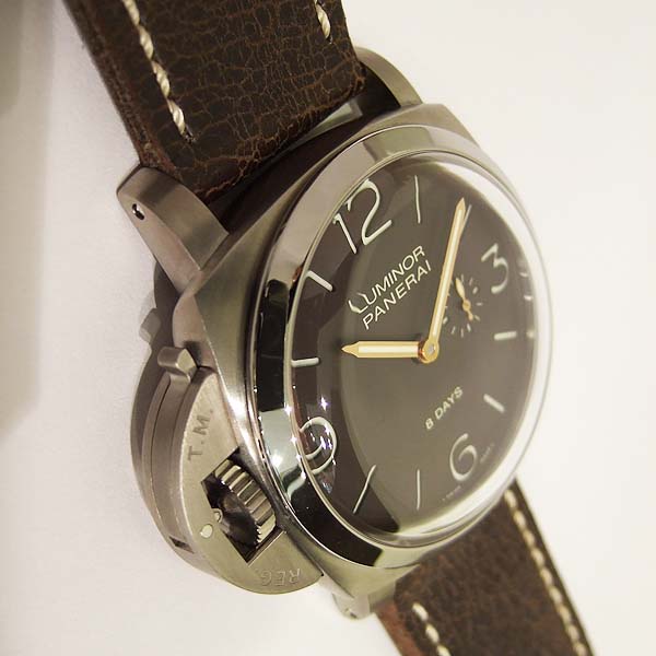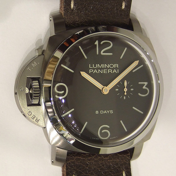 Luminor 1950 Titanio 8 Day - 47mm 左撇子限量錶/ 型號:PAM00368/ N 字頭僅限量製作1000只/ 採自製編號:P.2002 手上鏈機芯,3 個發條盒,完全由PANERAI研製/ 具時ˋ分ˋ小秒指示/ 暗棕色(菸草色)面盤/ 金色指針具夜光效果/ 夜光時標/ 8 天動力儲存於錶背扇形顯示/ 錶徑: 47 mm/ 鈦合金拋霧錶殼/ 大ㄇ型(普通型)鈦合金扣頭/ 特殊專利龍頭護橋(上有REG. 及 T.M.字樣)/ 金魚缸式圓弧形藍寶石水晶玻璃(厚度3.5毫米),具抗反光塗層/ 透明錶背可見 8 天動力儲存指示/ 防水達100米/ 搭配原廠深咖啡色舊化處理牛皮錶帶及棕色牛皮帶各 1 條方便自行拆換. |