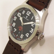 簡述: MILITARY 42 aut腕錶/ 型號:107-0635 / 採 ETA2824-2 自動上鏈機芯,機芯 25 石,動力儲存約:42小時/ 具時ˋ分ˋ秒大三針指示, 6 點方位日期窗/ 黑色面盤, 6 點方位印有紅鷹徽章及 SMILTARY