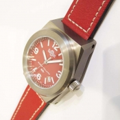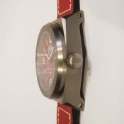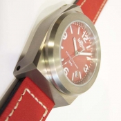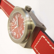簡述:	坦克砲塔系列自動腕錶/ 型號:M6/ 採瑞士 ETA 自動上鏈機芯/ 具時ˋ分ˋ秒指示/ 4~5 點間日期顯示/ 紅色面盤/ 白色阿拉伯數字及標誌線時標(具夜光效果)/ 銀邊指針(具夜光效果)/ 鈦合金材質霧面拋光處理錶殼/ 大型軍錶錶冠/ 手錶尺寸: 40mm 錶徑ˋ厚:12mm / 藍寶石水晶玻璃鏡面/ 鈦合金材質後底蓋,設有維修孔設計/ 搭配 22mm 紅色圓場牛皮錶帶/ 原廠鈦合金材質 ㄇ 型一般穿扣/ 防水: 100米.