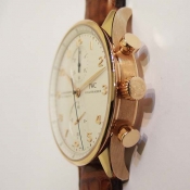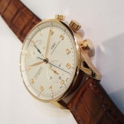 葡萄牙計時腕錶 / 型號:IW371480 / 錶殼 18 K 玫瑰金材質/ 採用IWC自製自動上鏈機芯,編號:79350,機芯為:Glucydur合金擺輪,動力儲存 44 小時/ 具時ˋ分ˋ秒指示,30分鐘又60秒計時碼錶功能/ 錶徑尺寸:40.9mm/ 白色錶面/ 柳葉型金色指針/ 金色阿拉伯數字及標誌型時標/ 藍寶石水晶鏡面 / 原廠咖啡色鱷魚皮帶及 18 K 玫瑰金穿扣/ 日常生活防水30米.