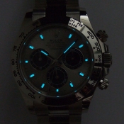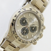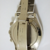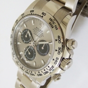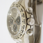 勞力士蠔式宇宙計型迪通拿腕錶/ 型號:116509/ 亂碼字頭(有防偽 ROLEX 字樣及流水號碼內圈)/ 18K 白金天文台錶/ 採自動上鏈機芯,機芯為:Cal:4130ˋ鍍銠機芯有魚鱗紋及日內瓦波紋打磨ˋ44顆紅寶石ˋ五方位調校ˋKIF避振裝置ˋ四臂環形合金擺輪ˋ無快慢針由四顆螺絲微調快慢ˋ雙層合金游絲ˋ橫跨式橋板ˋ由柱狀星形凸輪控制計時碼錶的啟動.停止.歸零ˋ雙向自動上鏈/ 蠔式摺疊扣錶帶/ 具時ˋ分ˋ秒指示及計時碼錶功能/ 刻有分度外圈方便即時計時速度ˋ生產速度等/ 旋入式表冠及旋轉按鈕錶冠/ 自動上鏈/ 金屬銀灰色錶面/ 立體標誌型時標及指針,具夜光效果/ 藍寶石水晶鏡面/ 蠔式錶帶及新款折疊式錶扣/ 防水深達:100米.