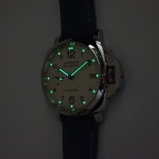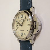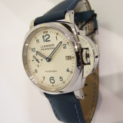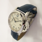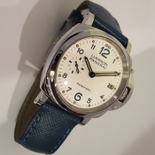 簡述: Luminor Due 1950 3 Day - 38mm 自動腕錶/ 型號:PAM00903/ U 字頭限量 2000 只(按壓式快拆錶帶)/ 採用 Panerai OP XXXIV 自動上鏈機芯/ 動力儲存 3 日/ 具時ˋ分ˋ小秒針ˋ日期顯示/ 錶殼38mm 316L 拋光及霧鋼材質/ 白色錶面/ 藍色阿拉伯數字時標,舊化處理夜光圓點時標及指針(具夜光效果)/ 藍寶石水晶鏡面/ 日常生活防水 30米/ 小ㄇ型錶扣/ 搭配原廠 20 X 18 mm 藍色牛皮錶帶.
