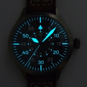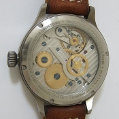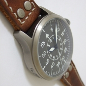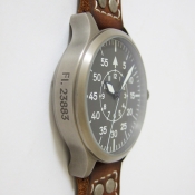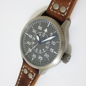 Nav B-Uhr 47 Titan B-Type Central Second 飛行員軍錶/ 型號: 107-0738 採瑞士 ETA Unitas 6497-1 手動上鏈機芯/ 機芯為:18石ˋ動力儲存約:42小時/ 具時ˋ分ˋ秒指示,停秒功能/ 炭泥灰色 B-Type 面盤/ 阿拉伯數字及標誌線時標(具夜光效果)/ 藍色邊緣指針(具夜光效果)及時標/ 鈦合金霧面噴砂舊化處理錶殼,鋼質後底蓋/ 大型軍錶錶冠/ 透明錶背,清楚鑑賞原廠自製將 6497-1 自製成為大 3 針自動機芯的功力/ 手錶尺寸: 47mm 錶徑ˋ厚:14.0mmˋ重 105 公克 / 藍寶石水晶玻璃鏡面/ 搭配 22mm 深咖啡色彷舊處理鉚釘錶帶/ ㄇ字錶扣/ 防水: 30米.