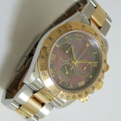 簡述: 勞力士蠔式宇宙計型迪通拿腕錶/ 型號:116523/ P 字頭/ 18K 黃金& 904L 不銹鋼天文台錶/ 採自動上鏈機芯,機芯為:Cal:4130ˋ鍍銠機芯有魚鱗紋及日內瓦波紋打磨ˋ44顆紅寶石ˋ五方位調校ˋKIF避振裝置ˋ四臂環形合金擺ˋ、無快慢針由四顆螺絲微調快慢ˋ雙層合金游絲ˋ橫跨式橋板ˋ由柱狀星形凸輪控制計時碼錶的啟動.停止.歸零ˋ雙向自動上鏈/ 蠔式摺疊扣錶帶/ 具時ˋ分ˋ秒指示及計時碼錶功能/ 刻有分度外圈方便即時計時速度ˋ生產速度等/ 旋入式表冠及旋轉按鈕錶冠/ 自動上鏈/ 珍珠母貝錶面/ 金色羅馬字時標及指針(具夜光效果)/ 藍寶石水晶鏡面/ 蠔式錶帶及新款折疊式錶扣/ 防水深達:100米.