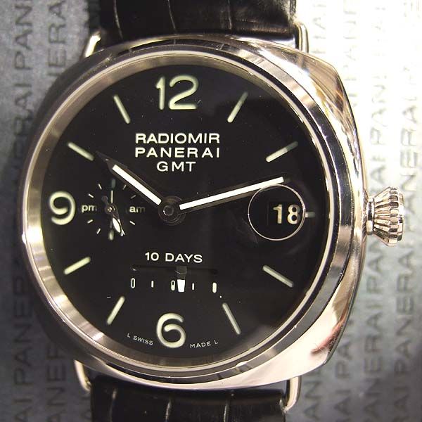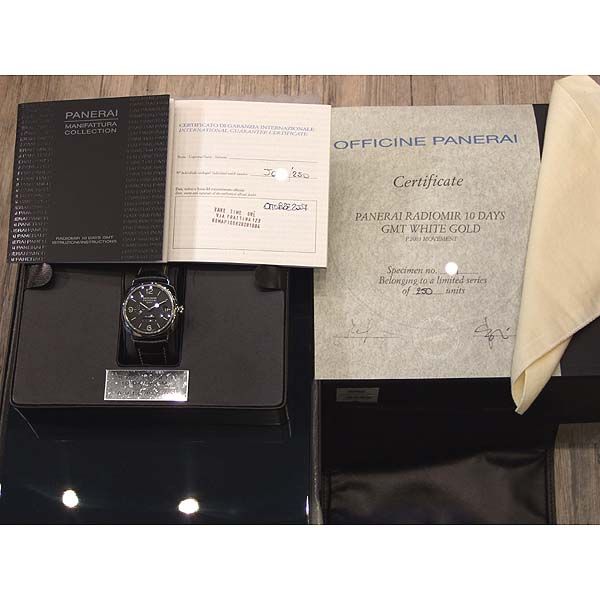 簡述:	Radiomir 10 Days GMT White Gold 10日鏈限量腕錶/ 型號:PAM00235/ J 字頭僅限量製作250只/ 採用Panerai P.2003 自動上鏈機芯/ 機芯為:25石ˋ 每小時擺率 28800次ˋ動力儲存達 10 日/ 具時ˋ分ˋ秒ˋ日期顯示ˋ兩地時間功能日夜am.pm 顯示ˋ直線動力儲存 10 日顯示/ 錶殼45mm 18K金材質/ 藍寶石水晶鏡面/ 防水達100米/ 可調節式原廠18K白金摺疊扣/ 原廠黑色鱷魚皮錶帶.