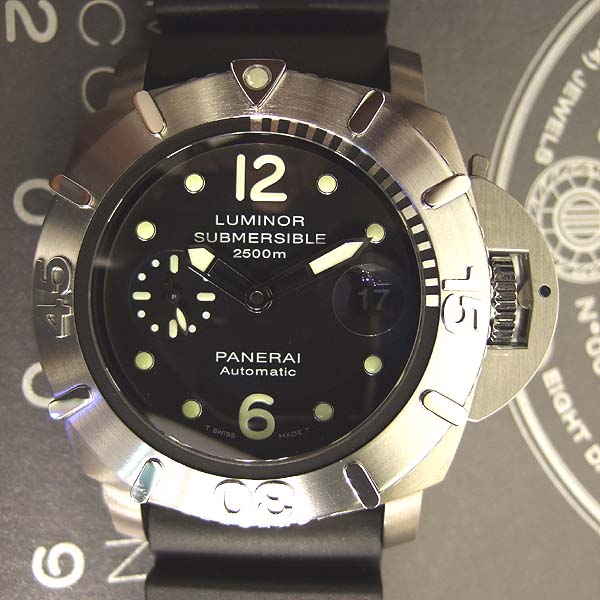 Luminor Submersible 2500M / 型號:PAM00285/ K 字頭(2008年)僅限量製作 250 只/ 採用 OP III 自動上鏈機芯/ 機芯為:13又1/4 法分ˋ21石ˋ震頻 28800ˋ 錶橋與擺重刻有PANERAI字樣ˋ42小時動能儲存ˋ獲天文台認證(C.O.S.C)/ 具時ˋ分ˋ小秒指示及日期顯示窗/ 專利防水錶冠護橋裝置/ 錶徑:47mm/ 錶殼設有排氦氣閥/ 單向旋轉潛水計時錶圈可計算入水時間/ 黑色面盤/ 夜光指針與時標(T Dial) / 藍寶石水晶鏡面/ 防水深達2500米. |