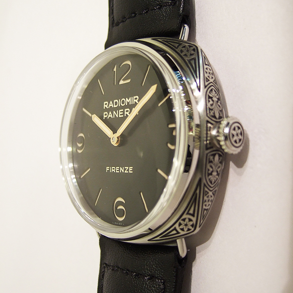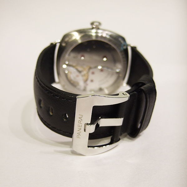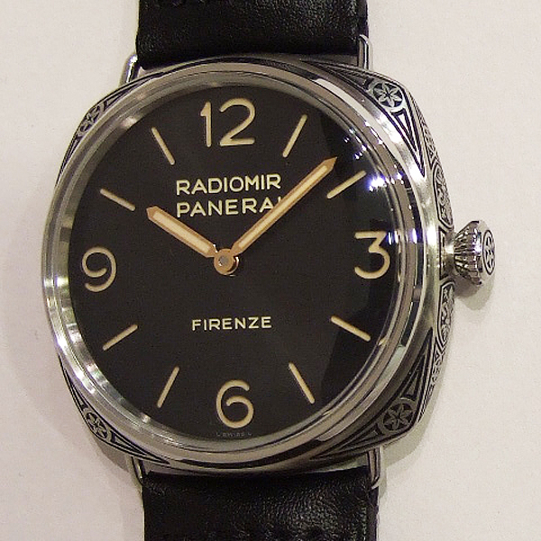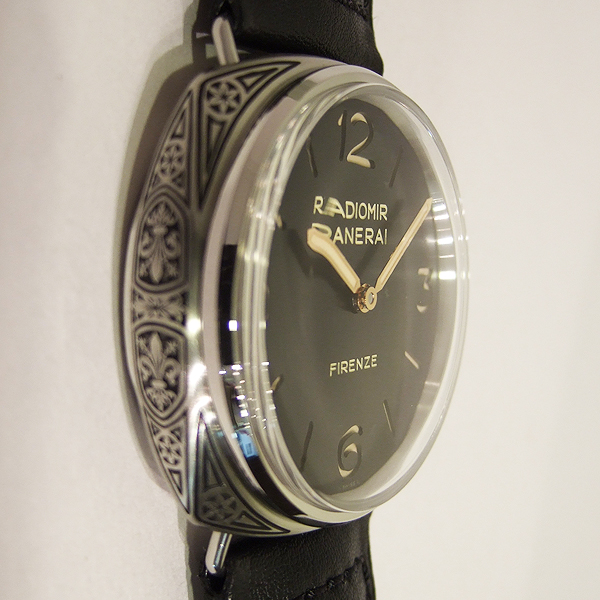 Radiomir 3 Day - 47mm 佛羅倫斯發源專賣店限量腕錶/ 型號:PAM-00604/ R 字頭僅限量製作 99 只/ 採自製編號:P.3000 手上鏈機芯, 厚:5.3mm,16 1/2法分, 21石, 2 個發條盒,Glucydur平衡擺輪,每小石震頻 21,600次,Incabloc防震裝置,3 天動力儲存, 2 個發條盒,160個零件,完全由PANERAI研製/ 具時ˋ分指示/ 三明治式刻度鏤空黑色面盤/ 金色指針/ 舊化處理夜光指針及時標/ 錶徑: 47 mm/ 鋼材質刻花錶殼/ 藍寶石水晶玻璃鏡面及透明後底蓋/ 防水達100米/ 搭配原廠黑色鱷魚皮錶帶/ 鋼質刻花ㄇ型(普通型)扣頭. |