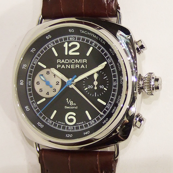 沛納海 Radiomir one/eighth second/1/8 秒閃電雙追針腕錶/ 型號PAM-00246/ I 字頭全球限量製作僅 300 只/ 機芯為:採用Panerai 編號:OP XXI 自動上鏈機芯,每小時擺率28800次,42石,動力儲存42小時/ 具時ˋ分ˋ秒指示,1/8秒計時碼錶功能/ 黑色錶面,錶面 6 點方位標有1/8th計時字樣/ 錶殼45mm/ 316L 精鋼材質/ 搭配原廠咖啡色鱷魚皮錶帶及摺疊式錶扣/ 防水達100米. |