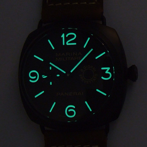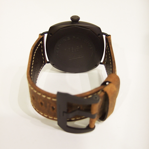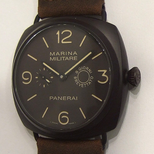 Radiomir Composite Marina Militare 8 Giorni 限量腕錶/ 型號:PAM-00339/ M 字頭僅製作1500只/ 採自製編號:P.2002/ 手上鏈機芯,3 個發條盒,完全由 PANERAI研製/ 具時ˋ分ˋ小秒指示/ 暗棕色(菸草色)面盤/ 3 點方位 8 Giorni BREVETTATO 字樣/ 夜光指針及時標/ 具 8 天動力儲存/ 錶徑: 47 mm/ 陶化鋁錶殼/ 藍寶石水晶玻璃鏡面/ 防水達100米/ 搭配原廠身咖啡色作舊牛皮錶帶/ ㄇ型一般穿扣.