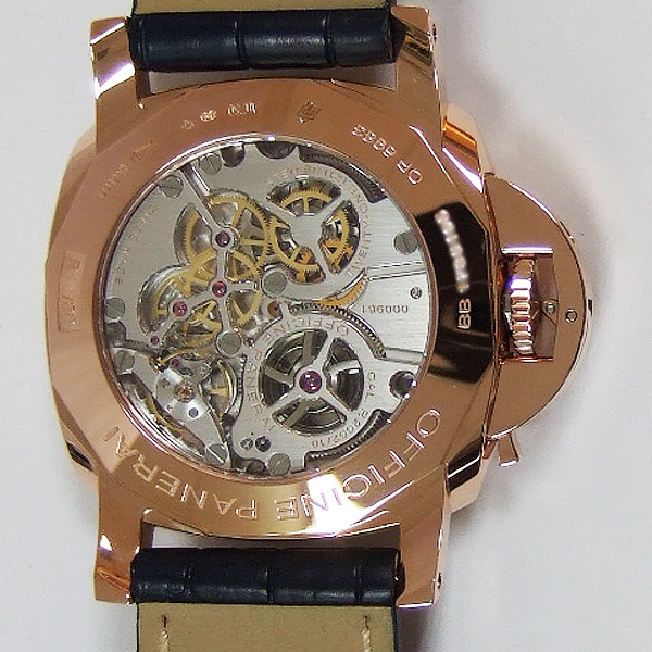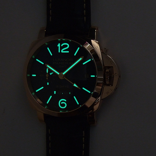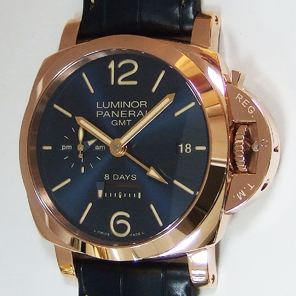 Luminor 1950 8 Days GMT 8日動力雙時區特別訂製錶/ 型號:PAM-00623/ R 字頭僅限量製作 30 只/ 採自製P.2002/1 手上鏈機芯,完全由PANERAI研製/ 具時.分.小秒.日期顯示/ 12小時制第 2 地時區顯示指針/ 9 點方位日夜顯示指示盤/ 秒針對時歸零裝置/ 3 個發條盒/ 8 天動力儲存橫列式線形顯示/ 錶徑: 44 mm,18 K玫瑰金錶殼/ 藍寶石水晶玻璃鏡面及後底蓋(可見原廠自製機芯鏤空處理)/ 獨特錶冠護橋/ 藍色金屬光澤錶面,夜光時標及6.12阿拉伯數字/ 防水達100米/ 原廠深藍鱷魚皮錶帶. |