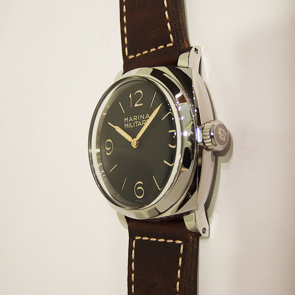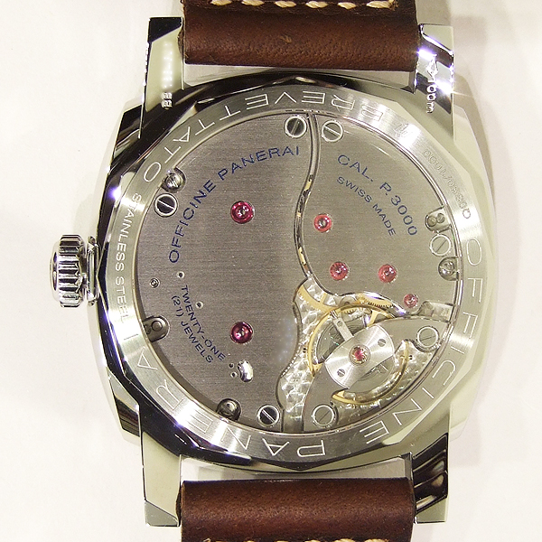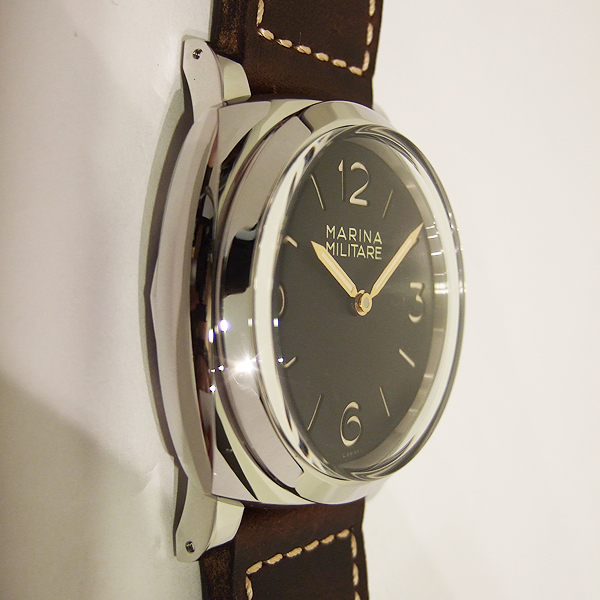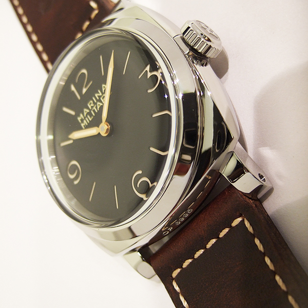 Radiomir 1940 3 Day - 47mm 3日鏈限量腕錶/ 型號:PAM00587/ Q 字頭僅限量製作1000只/ 採自製編號:P.3000 手上鏈機芯, 厚:5.3mm,16 1/2法分, 21石, 2 個發條盒,Glucydur平衡擺輪,每小石震頻 21,600次,Incabloc防震裝置,完全由PANERAI研製/ 具時ˋ分示/ 黑色面盤(三明治面盤)/ 舊化夜光指針及時標/ 錶徑: 47 mm/ 精鋼拋亮面錶殼/ 大ㄇ型(普通型)鋼質扣頭/ 旋入式錶冠(上有O.P.創廠 LOGO字樣)/ 金魚缸式圓弧形 P lexiglas 樹脂玻璃(厚度3毫米)/ 藍寶石水晶透明錶背/ 防水達100米/ 搭配原廠深咖啡色舊化皮帶. |