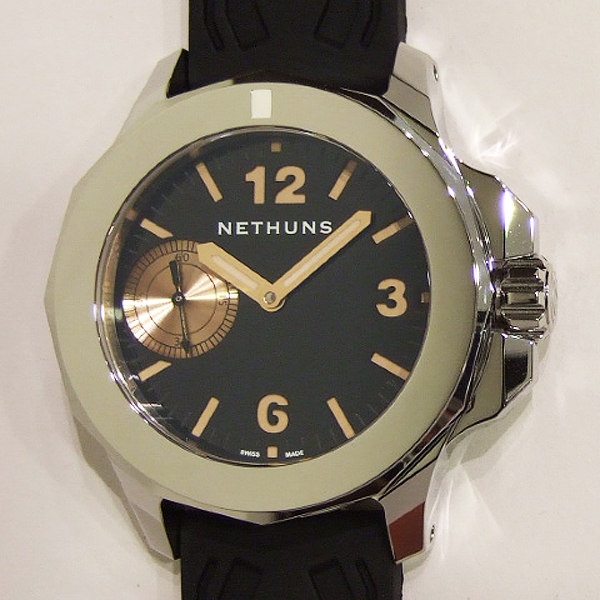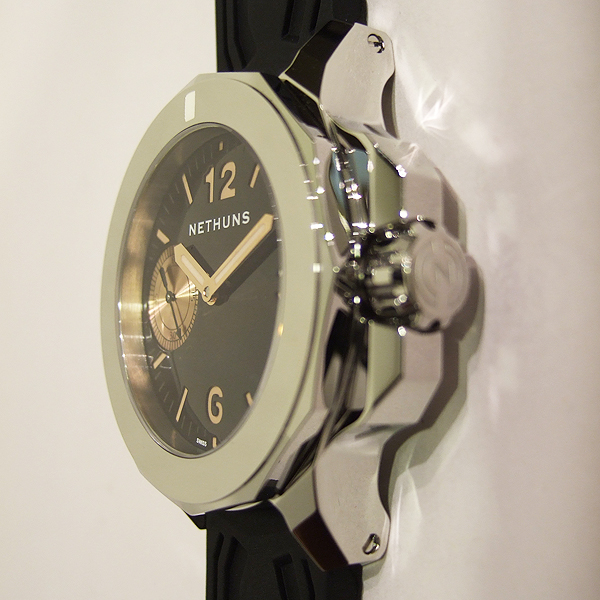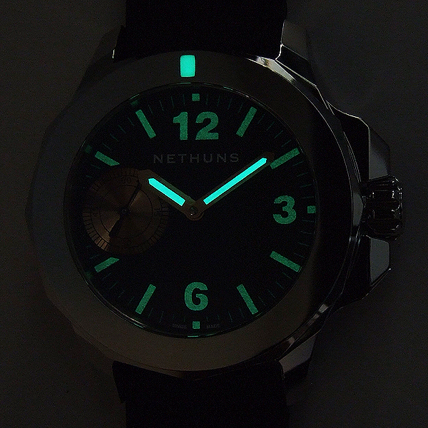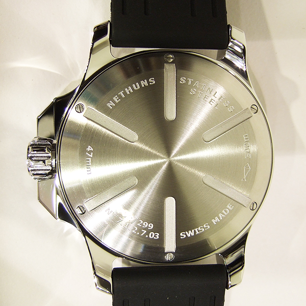 NETHUNS 義大利品牌潛水腕錶/ 限量299只/ 型號:7.1.2.7.03/ 採瑞士 Unitas 6497手上鏈機芯/ 機芯為:17石ˋ動力儲存:46小時/ 具時ˋ分ˋ指示/ 黑色三明治面盤, 9 點方位金色小秒針盤/ 阿拉伯數字時標及標誌線時標/ 銀色指針(具夜光效果)/ 可單向旋轉潛水外圈,可計算入水時間/ 手錶尺寸: 47mm錶徑/ 防炫藍寶石水晶玻璃鏡面/ 霧面鋼錶底蓋,厚:3.7mm/ 搭配 24mm 原廠黑色橡膠錶帶/ ㄇ字型鋼質錶扣/ 防水: 300米. |