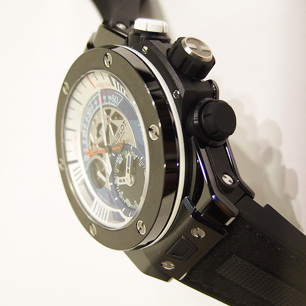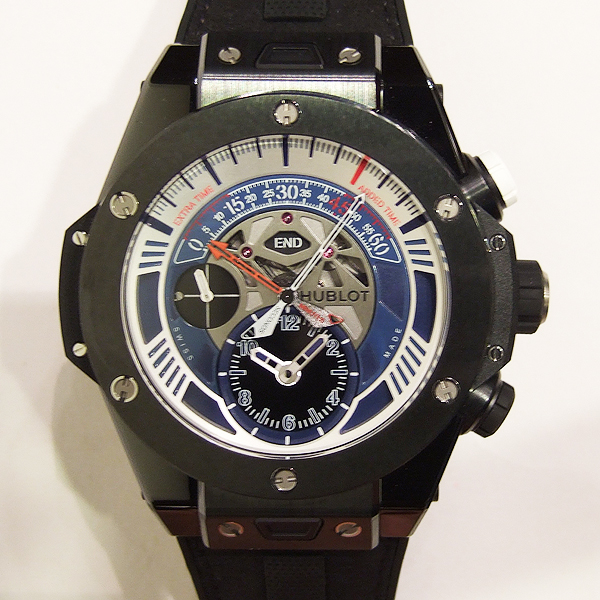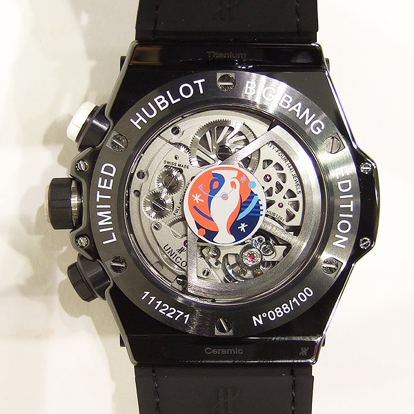 BIG BANG UNICO 2016 年歐洲杯足球賽限量計時碼錶/ 全球限量 100 只/ 型號:413.CX.7123.LR.EUR16/ 採瑞士採原廠自製自動上鏈機芯,機芯編號 :HUB 1261/ 具時ˋ分指示/ 雙逆跳計時碼錶功能/ 歐洲杯配色鏤空面盤/ 立體標誌線時標/ 銀色指針(具夜光效果)/ 鋼質錶殼 PVD 黑色,黑色陶瓷錶圈/ 大型錶冠/ 手錶尺寸: 45mm 錶徑/ 防眩藍寶石水晶玻璃鏡面/ 透明後底蓋/ 搭配原廠黑色橡膠錶帶/ 原廠摺疊式錶扣/ 防水: 100米 |