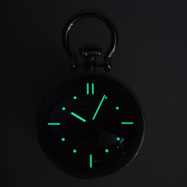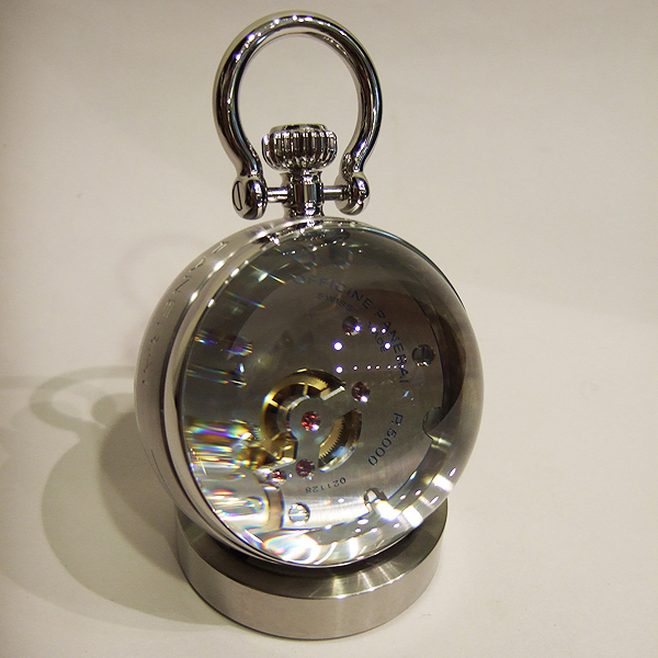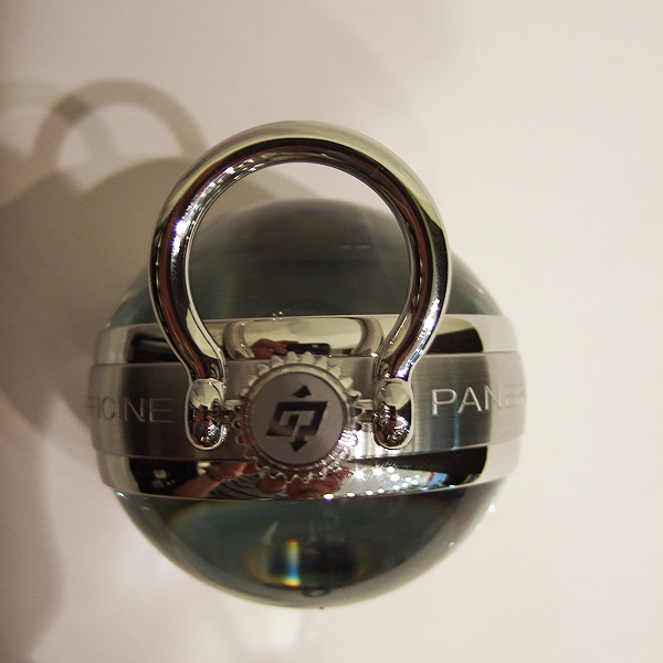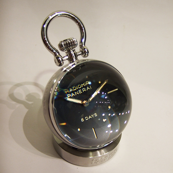 8 Days 水晶球座鐘/ 型號:PAM00641/ 採Panerai自製 P5000 手上鏈機芯/ 機芯為:15 3/4法分ˋ21石ˋ厚4.5毫米ˋ每小時擺率21600次ˋKIF 防震裝置ˋ動力儲存 8 日ˋ2個發條盒ˋ127個零件/ 球體造型,直徑:65mm/ 黑色面盤,6點方位 8 DAYS 字樣/ 夜光時標及指針/ 座鐘殼為水晶玻璃及鋼材質/ 12 點方位上鏈調時手冠/ 透明球體可見機芯/ 附原廠鋼質擺放底座. |