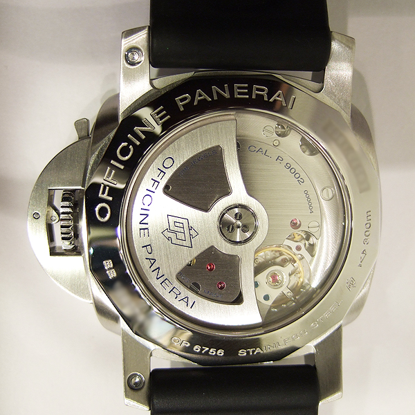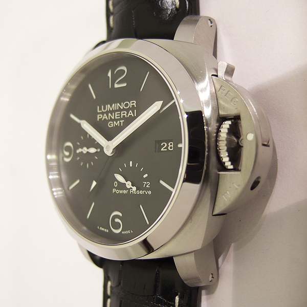 Luminor 1950 Marina 3 Day GMT Power Reserve 自動腕錶/ 型號:PAM-00321/ R 字頭(可快拆式錶帶),限量2500只/ 採用Panerai自製 P.9002 自動上鏈機芯/ 機芯為:13 3/4 法分ˋ 29石ˋ 每小時擺率 28800次ˋ Incabloc防震裝置ˋ 動力儲存 3 日/ 具時ˋ分ˋ小秒針ˋ日期顯示,第 2 地時間指示,動力儲存顯示,秒針歸零裝置/ 錶殼44mm 316L 拋光及霧鋼材質/ 黑色錶面(三明治錶盤)/ 夜光時標及指針/ 藍寶石水晶鏡面/ 防水達300米/ ㄇ型錶扣/ 附原廠黑色膠帶及黑色鱷魚皮錶帶.