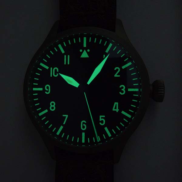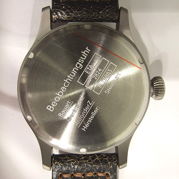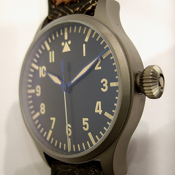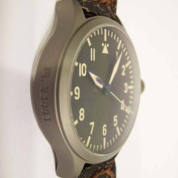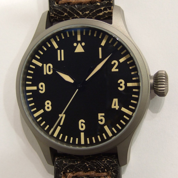 Nav B-Uhr 47 Vintage TITANIUM A-Muster 飛行員軍錶/ 型號: 107-0402/ 採瑞士 ETA2824-2 自動上鏈機芯/ 機芯為:25石ˋ動力儲存約:42小時/ 具時ˋ分ˋ秒指示/ 黑色面盤/ 舊化阿拉伯數字及標誌線時標(具夜光效果)/ 藍色邊緣指針(具夜光效果)及時標/ 鈦合金霧面噴砂舊化處理錶殼,鋼質後底蓋/ 大型軍錶錶冠/ 錶背刻有使用之材質ˋ機芯表/ 手錶尺寸: 47mm 錶徑ˋ厚:14.2mmˋ重 114 公克 / 藍寶石水晶玻璃鏡面/ 搭配 22mm 深咖啡色彷舊處理錶帶/ ㄇ字錶扣/ 防水: 30米. |