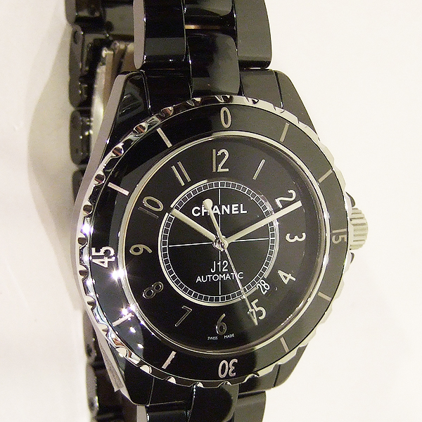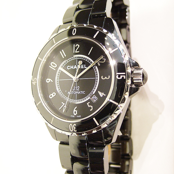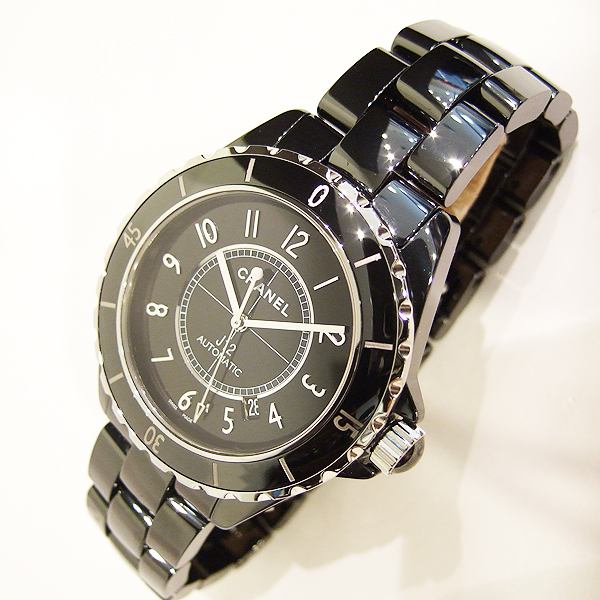 J 12 自動腕錶/ 採用自動上鏈機芯/ 具時ˋ分ˋ秒指示/ 4~5 點間日期視窗/ 黑色錶面/ 阿拉伯數字時標/ 銀色指針/ 全錶採抗磨耗精密陶瓷材質/ 單向可旋轉黑色陶瓷錶圈,可計算入水時間/ 鋼質摺疊式錶扣/ 錶徑:38mm/ 藍寶石水晶鏡面/ 防水 200 米.