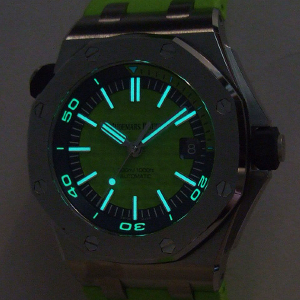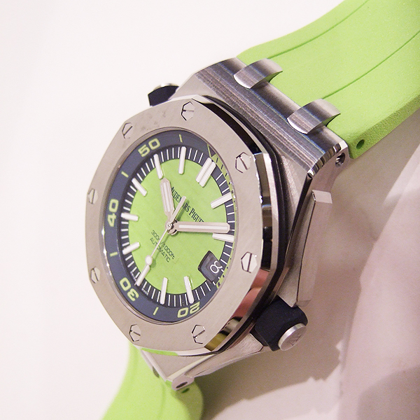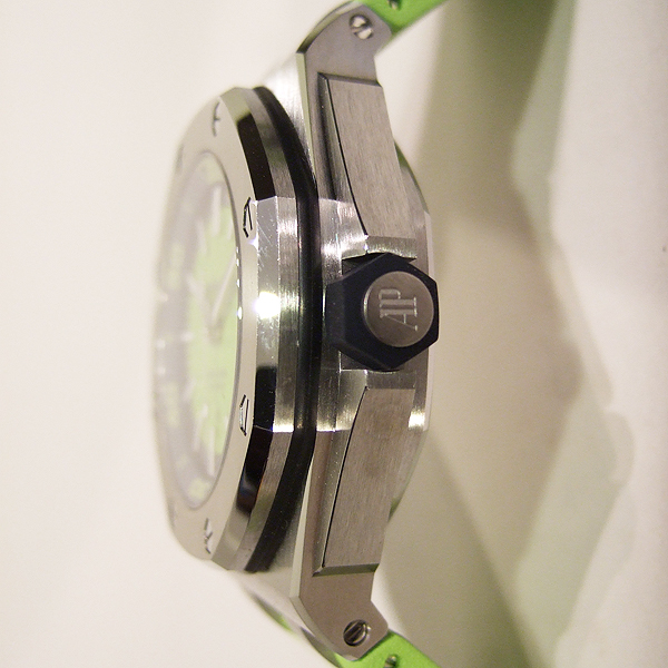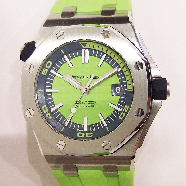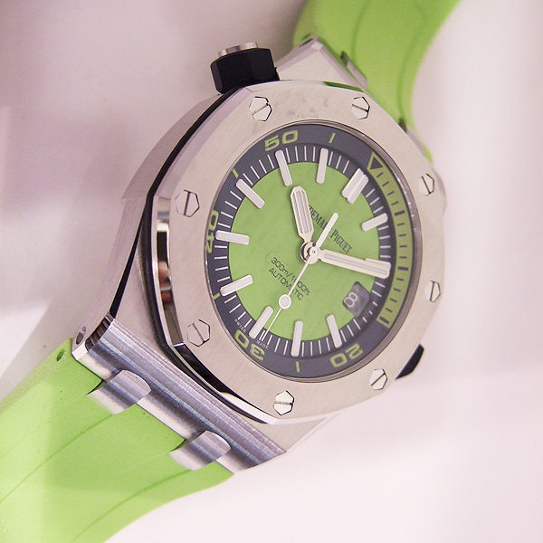 皇家橡樹離岸型潛水錶/ 型號:15710ST.00.A038CACA.01/ 採自動上鏈機芯/ 錶徑:42mm/ 具時ˋ分ˋ小秒針及 3 點方位日期顯示窗,錶內圈可調式潛水時間計時,可計算入水時間,由錶殼上 10 點方位調整紐調整/ 綠色格紋面盤/ 夜光標誌型時標及指針/ 機芯編號:3120,機芯為: 40顆紅寶石,21K金自動盤,雙向自動上鏈,零件數共280個,動力儲存約 60 小時/ 藍寶石水晶玻璃/ 防水300米/ 搭配原廠綠色膠帶及鋼質ㄇ形一般穿扣. |