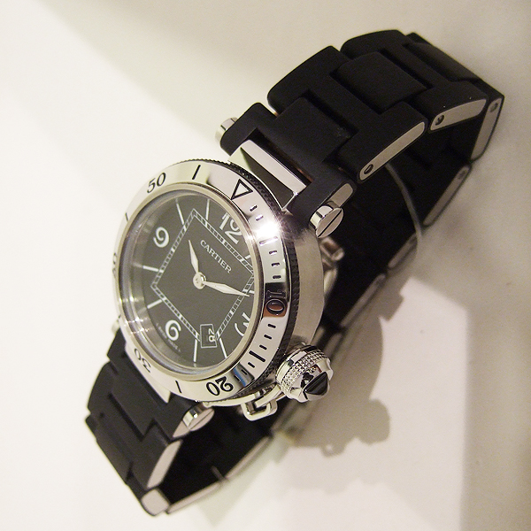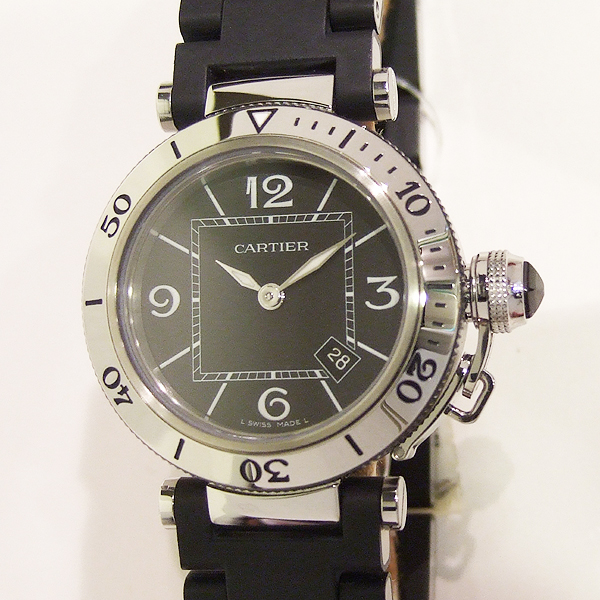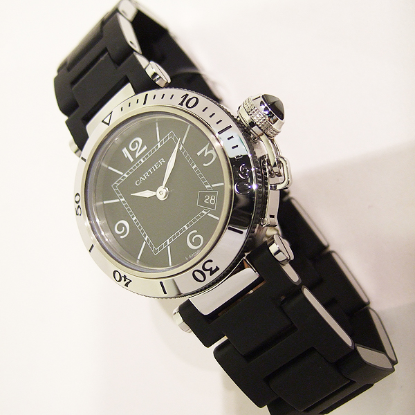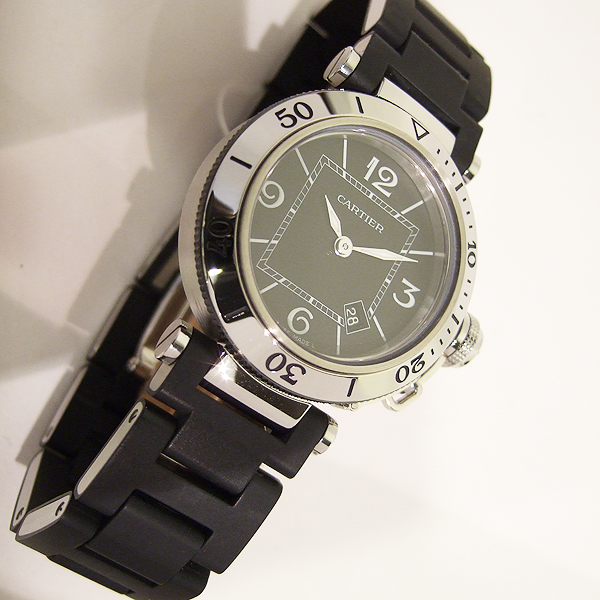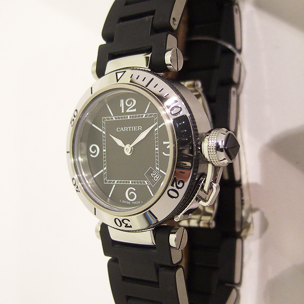 Pasha C 潛水腕錶/ REF:W3140003/ 採石英機心/ 具時ˋ分指示/ 黑色錶面搭配3.6.9.12及標線型夜光阿拉伯數字時標/ 夜光指針 / 4~5點方位日期窗 / 外圈單向旋轉外圈,可計算入水時間/ 錶徑:32 mm / 藍寶石水晶鏡面/ 搭配原廠鋼質黑色橡膠包覆鏈帶及折疊式錶扣/ 防水100米. |