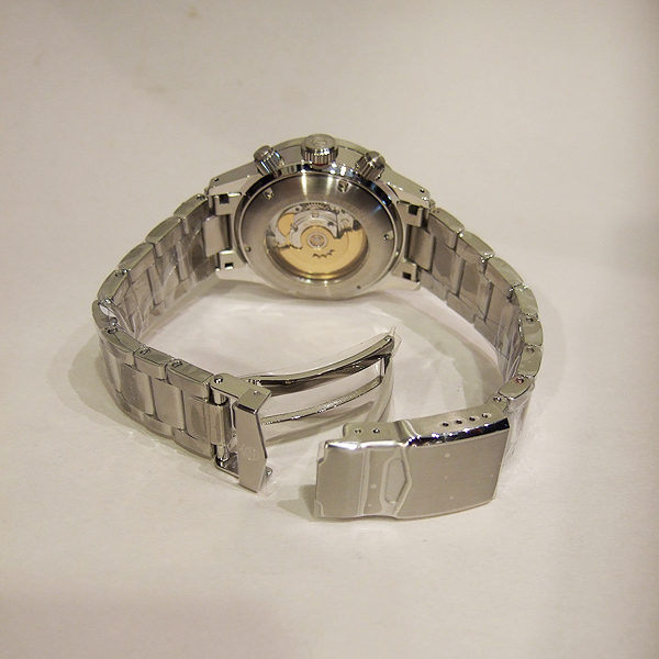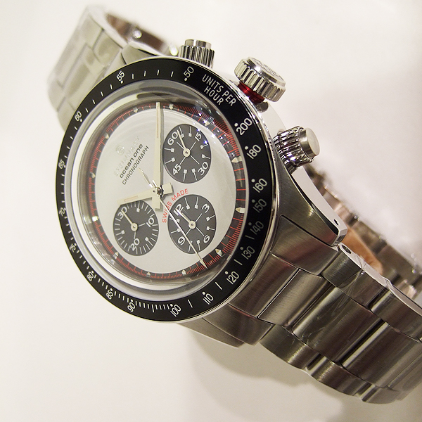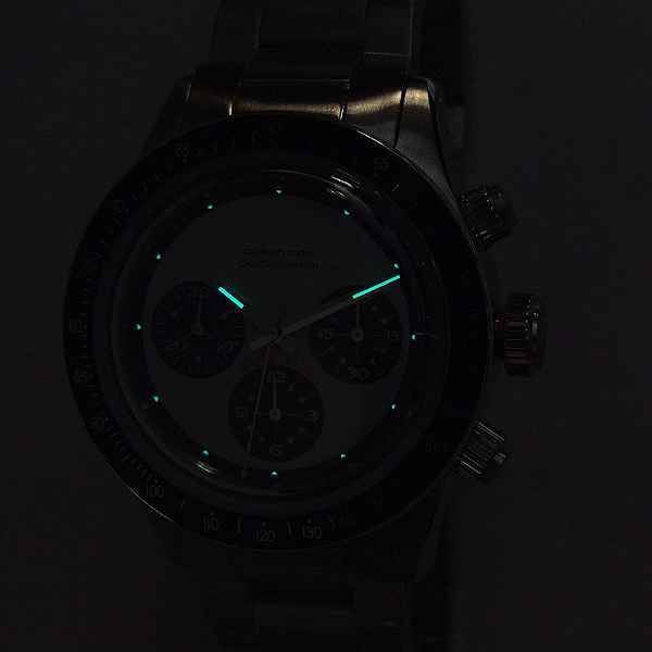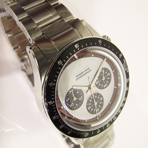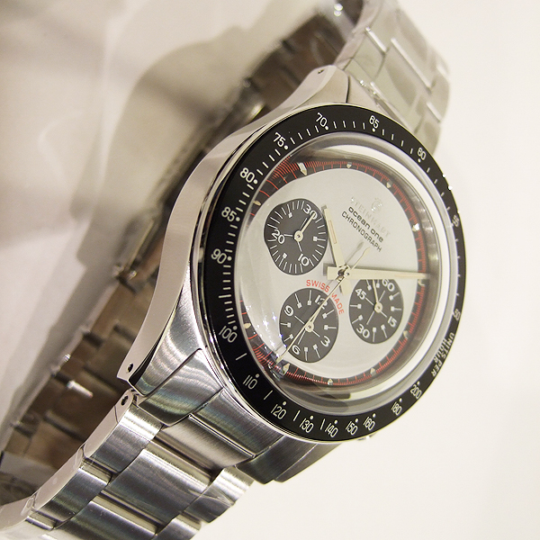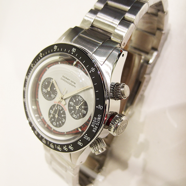 Ocean One Vintage Chronograph white 計時碼錶/ 型號: 108-0632 / 採瑞士 ETA 2824-2 TOP 自動上鏈機芯,機芯 51 顆紅寶石/ 具時ˋ分ˋ秒指示/ 計時碼錶功能/ 白色面盤,深灰色計時圈/ 銀色立體標誌型時標/ 銀色計時碼錶指針及紅色計時標線/ 銀色指針(具夜光效果)/ 鋼質霧面處理錶殼/ 旋入式大型錶冠及計時按鈕/ 手錶尺寸: 42mm 錶徑ˋ厚:18mmˋ重 123 公克 / 防眩凸面藍寶石水晶玻璃鏡面/ 透明底蓋/ 搭配 22mm 原廠鋼質練錶帶及原廠折疊式錶扣/ 防水: 100米. |