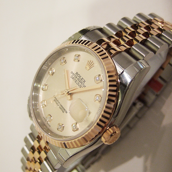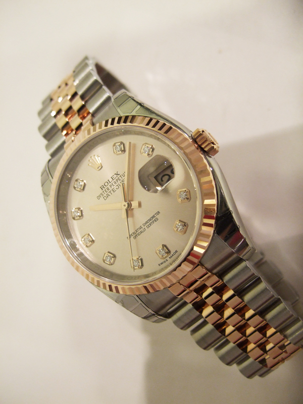 DATEJUST 蠔式天文男裝腕錶/型號:116231/ 採自動上鏈機芯(機芯編號:3135)/ 機芯為 31 顆紅寶石, 五方位調校,雙層合金游絲,有四顆微調快慢螺絲,橫跨式擺輪橋板,KIF避振裝置,天文台認證(C.O.S.C.)/ 錶徑:36mm/ 具時ˋ分ˋ秒針指示及 3 點方位日期顯示窗/ 玫瑰金色面盤/ 玫瑰金色指針/ 包鑲刻度鑽石時標(共10顆)/ 18K金錶圈/ 錶盤內圈刻有一圈防偽 ROLEX 字樣及流水號碼/ 藍寶石水晶玻璃鏡面/ 原廠不鏽鋼及18K玫瑰金五珠式錶帶及折疊式錶扣/ 防水100米. |