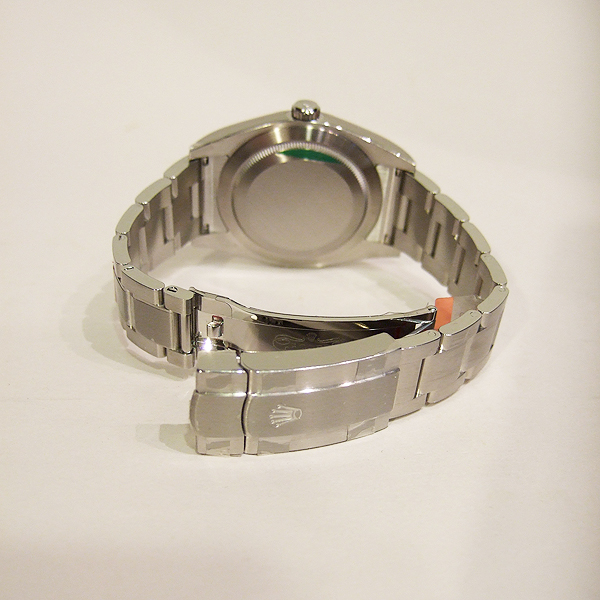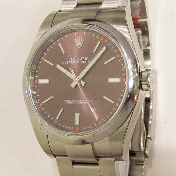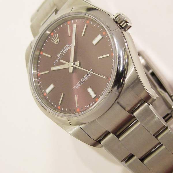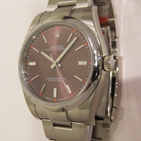 Oyster Perpetual 蠔式天文台腕錶/型號:114300/ 採自動上鏈機芯(機芯編號:3132)/ 機芯為 31 顆紅寶石, 五方位調校,雙層合金游絲,有四顆微調快慢螺絲,橫跨式擺輪橋板,KIF避振裝置,天文台認證(C.O.S.C.)/ 錶徑:39mm/ 具時ˋ分ˋ秒針指示/ 紫色面盤/ 銀色指針/ 3.6.9夜光刻度時標,其餘立體標線時標/ 錶盤內圈刻有一圈防偽 ROLEX 字樣及流水號碼/ 藍寶石水晶玻璃鏡面/ 原廠不鏽鋼蠔式錶帶及折疊式錶扣/ 防水100米.