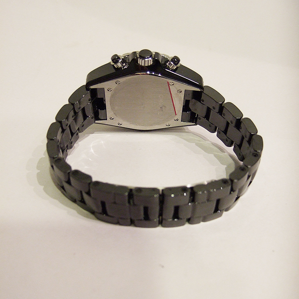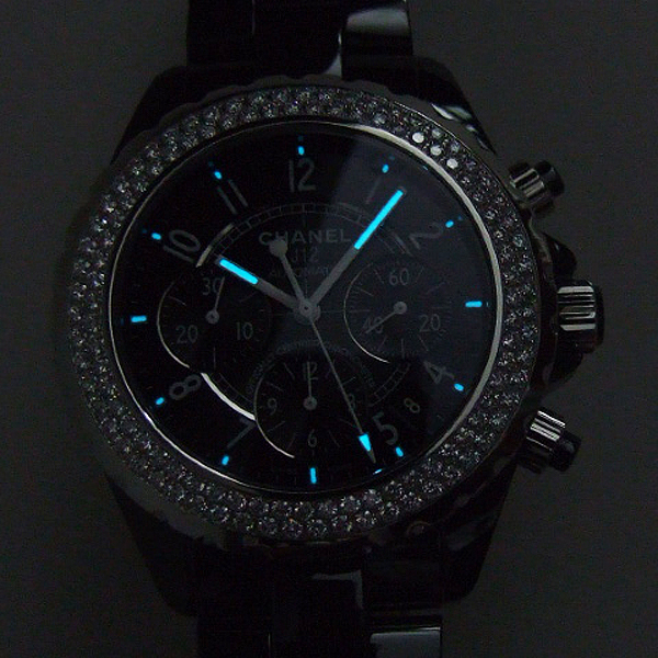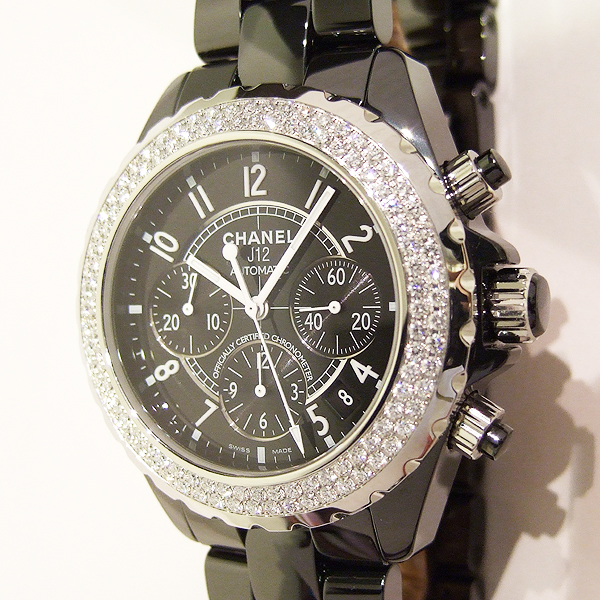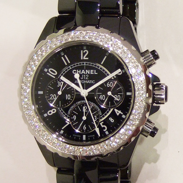 J 12 自動計時腕錶/ 採用自動上鏈機芯/ 具時ˋ分ˋ秒指示,計時碼錶功能/ 4~5 點間日期視窗/ 黑色錶面/ 阿拉伯數字時標/ 白色指針/ 全錶採抗磨耗精密陶瓷材質/ 原廠原鑲鑽石錶圈/ 鋼質摺疊式錶扣/ 錶徑:40mm/ 藍寶石水晶鏡面/ 防水 200 米.