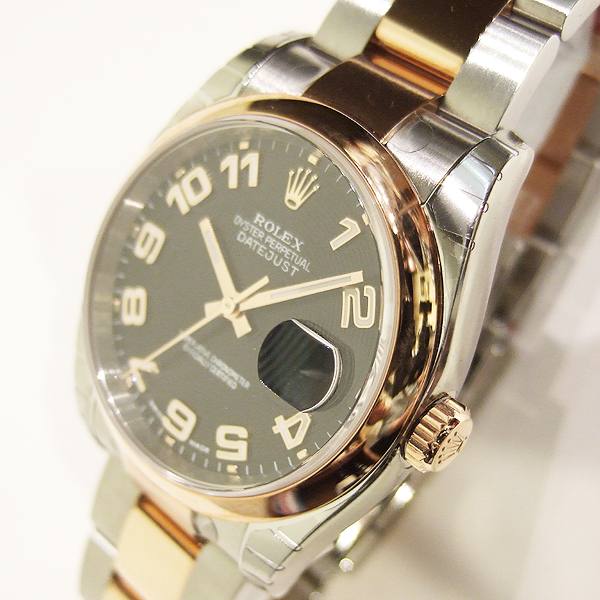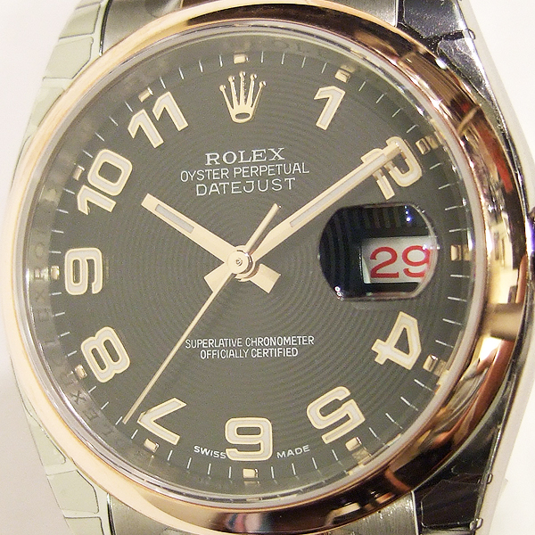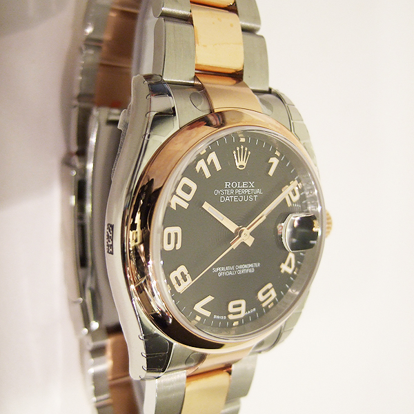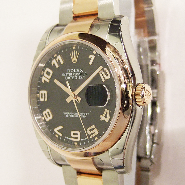DATEJUST 蠔式天文男裝腕錶/型號:116201/ 採自動上鏈機芯(機芯編號:3135)/ 機芯為 31 顆紅寶石, 五方位調校,雙層合金游絲,有四顆微調快慢螺絲,橫跨式擺輪橋板,KIF避振裝置,天文台認證(C.O.S.C.)/ 錶徑:36mm/ 具時ˋ分ˋ秒針指示及 3 點方位日期顯示窗/ 黑色同心圓暗紋面盤/ 玫瑰金色指針(具夜光功能)/ 立體阿拉伯數字時標(具夜光功能)/ 18K金錶圈/ 錶盤內圈刻有一圈防偽 ROLEX 字樣及流水號碼/ 藍寶石水晶玻璃鏡面/ 原廠不鏽鋼及18K玫瑰金蠔式錶帶及折疊式錶扣/ 防水100米. |