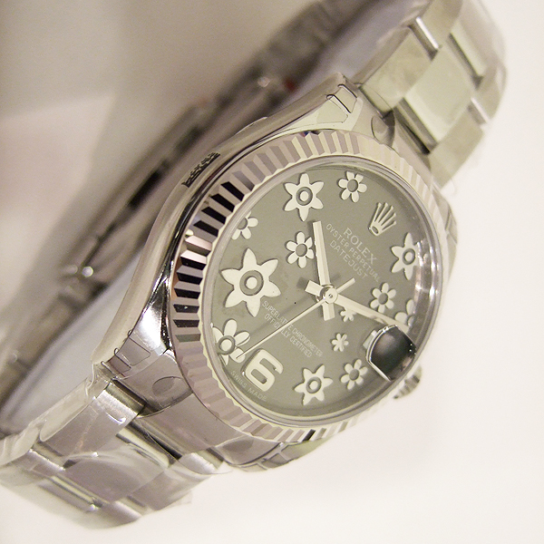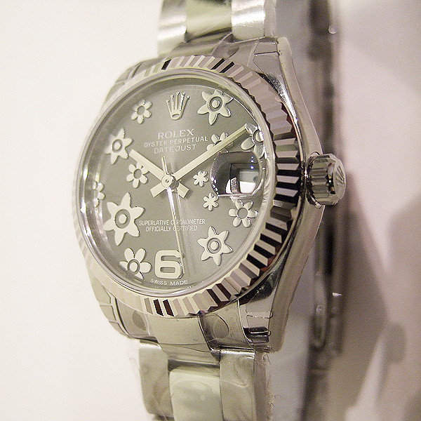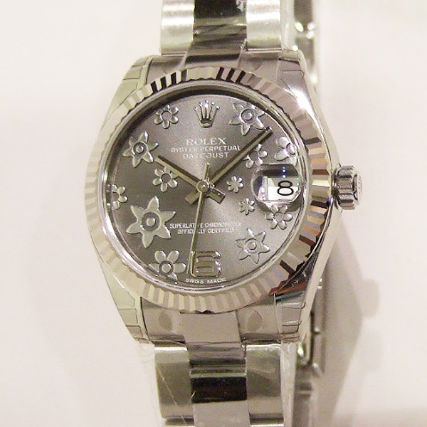 蠔式天文台女裝腕錶/型號:178274/ 採自動上鏈機芯/ 機芯編號:2235,機芯為 31 顆紅寶石, 五方位調校,雙層合金游絲,有四顆微調快慢螺絲,橫跨式擺輪橋板,KIF避振裝置,天文台認證(C.O.S.C.)/ 錶徑:31mm/ 具時ˋ分ˋ秒針指示及 3 點方位日期顯示窗/ 深灰色面盤,上有花朵浮雕/ 銀色指針及時標/ 18 K白金錶圈/ 錶盤內圈刻有一圈防偽 ROLEX 字樣及流水號碼/ 藍寶石水晶玻璃鏡面/ 原廠不鏽鋼蠔式錶帶及折疊式錶扣/ 防水100米. |