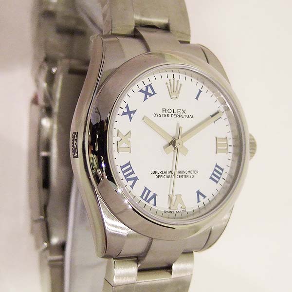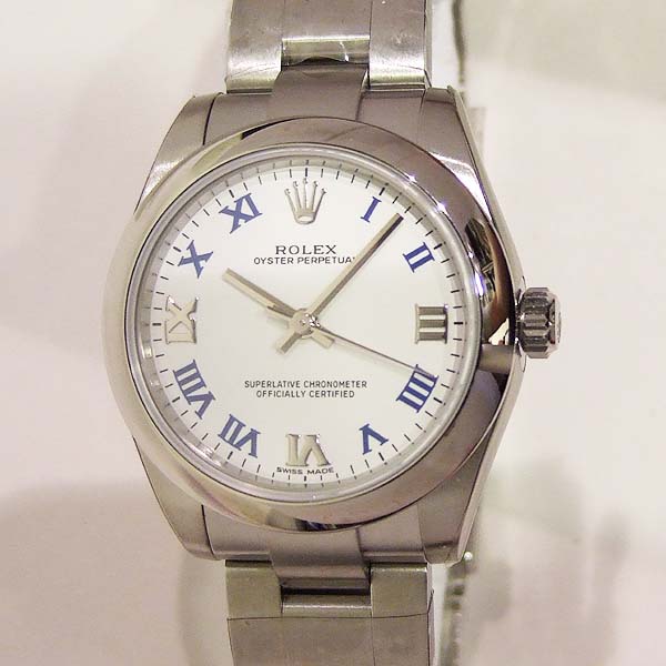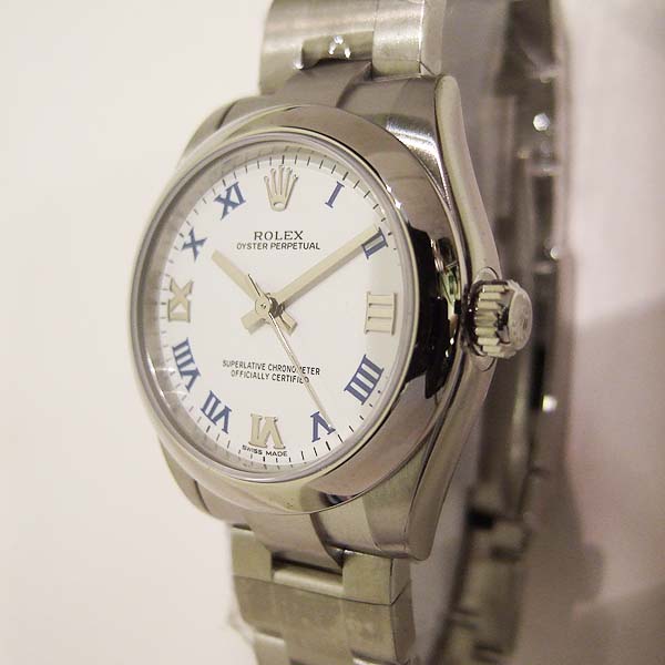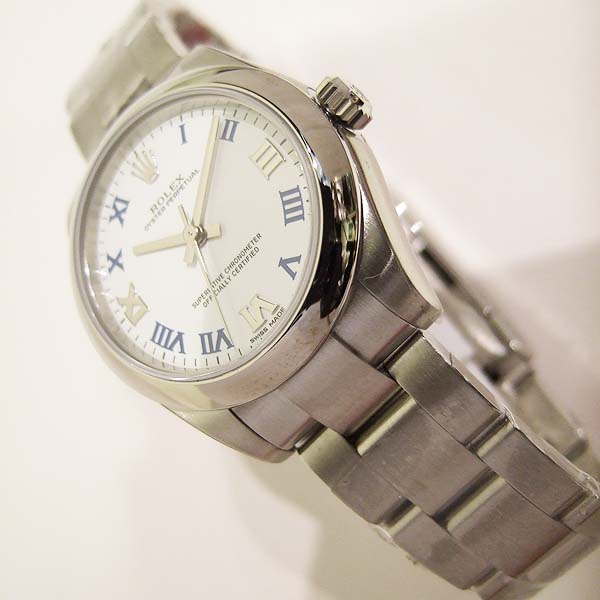 蠔式女裝腕錶/ 號:179171/ 採自動上鏈機芯/ 機芯:五方位調校,雙層合金游絲,有四顆微調快慢螺絲,橫跨式擺輪橋板,KIF避振裝置,天文台認證(C.O.S.C.)/ 錶徑:31mm/ 具時ˋ分ˋ秒針指示/ 白色面盤/ 銀色指針及銀色立體及藍色印刷羅馬數字時標/ 全錶 904 L 不銹鋼材質/ 錶盤內圈刻有一圈防偽 ROLEX 字樣及流水號碼/ 藍寶石水晶玻璃鏡面/ 原廠蠔式錶帶及折疊式錶扣/ 防水100米. |