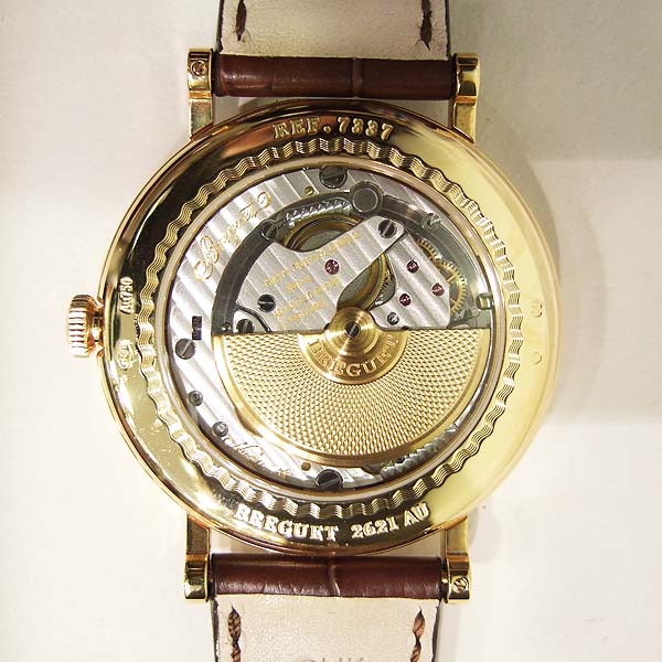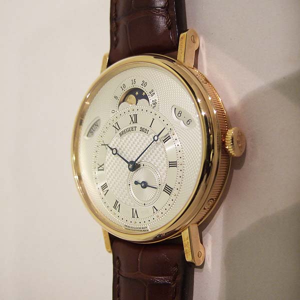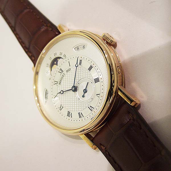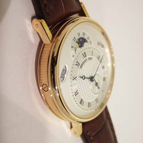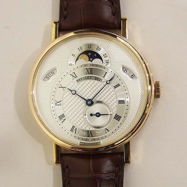 月像男裝腕錶/ 型號:7337/ 採 4/3 鉈自動上鏈機芯/ 錶徑:39mm(蛋形)/ 具時ˋ分ˋ秒針指示,12點方位月像顯示,2點方位日期視窗,10點方位星期視窗/ 格紋面盤/ 藍鋼寶璣式指針及藍色羅馬數字時標/ 全錶18K黃金材質/ 藍寶石水晶玻璃鏡面,透明底蓋/ 搭配原廠咖啡色鱷魚皮錶帶及18K黃金折疊式錶扣/ 日常防水30米. |