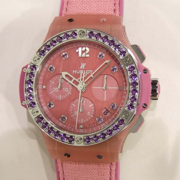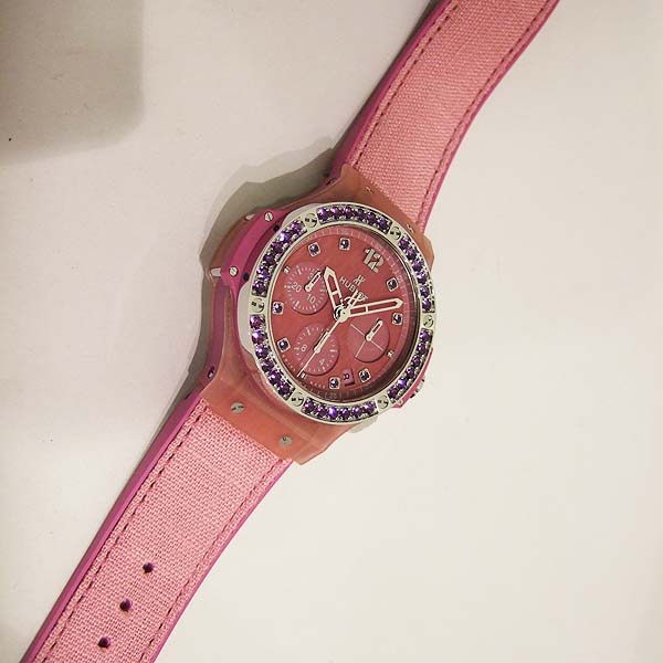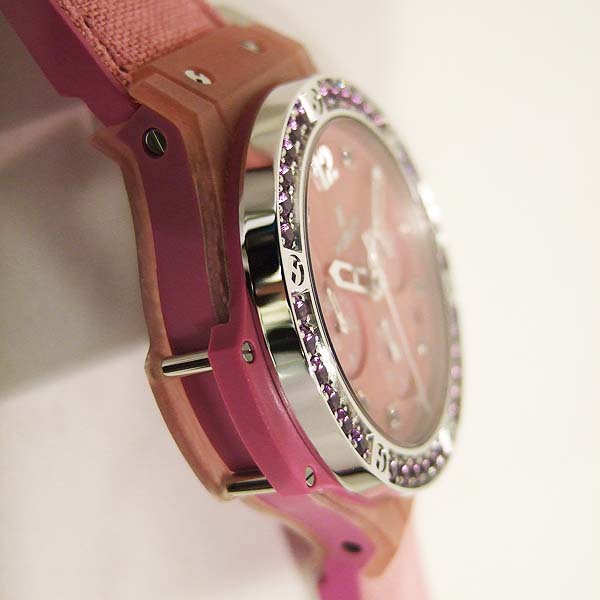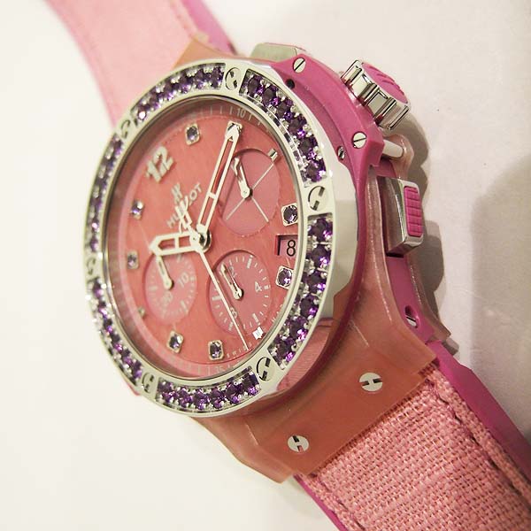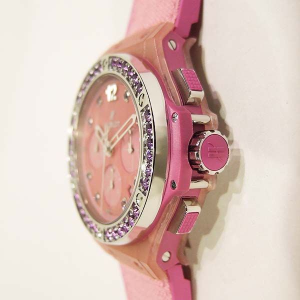 BIG BANG 38 EDITION 限量計時碼錶/ 限量 200 只/ 型號:341.XP 2770/ 採瑞士採原廠自製自動上鏈機芯,機芯編號 :HUB 4100,37顆紅寶石/ 具時ˋ分ˋ秒指示, 4~5 點間日期顯示窗/ 計時碼錶功能/ 桃色面盤/ 12點銀白色立體阿拉伯數字時標,其餘紫色水晶刻度/ 銀色指針/ 鋼及高硬度塑料錶殼/ 鋼質錶圈上原廠原鑲紫色水晶/ 大型錶冠/ 手錶尺寸: 43mm 錶徑/ 防眩藍寶石水晶玻璃鏡面/ 透明後底蓋/ 搭配原廠桃色橡膠蒙布面錶帶/ 原廠摺疊式錶扣/ 防水: 100米. |