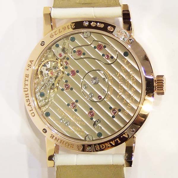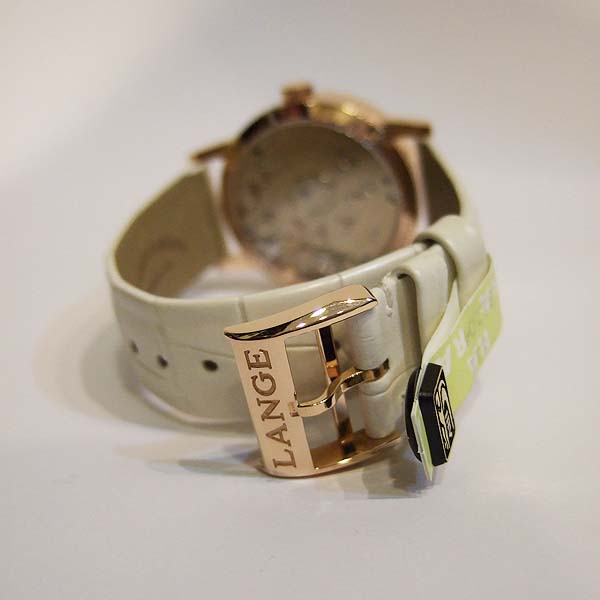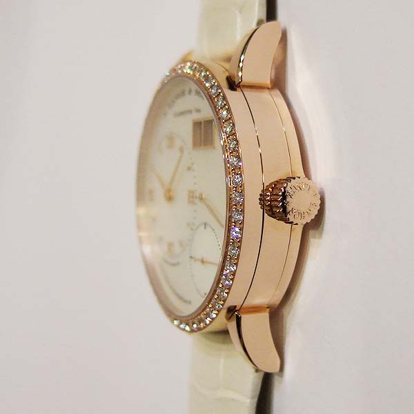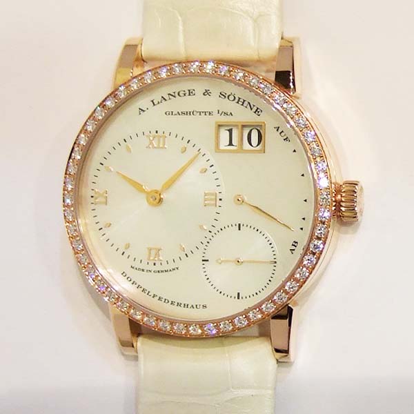 A. Lange 朗格女裝腕錶(Little Lange 1)/ 採原廠編號:L901.4 手上鏈機芯,機芯 53 顆紅寶石,動力儲存 72 小時/ 具時ˋ分ˋ秒指示, 2 點方位雙位數大日期視窗, 3 點方位 72 小時動力儲存指示盤/ 錶徑:36mm/ 白色珍珠母貝面盤/ 玫瑰金立體刻度時標/ 錶殼原鑲錶圈鑽飾/ 藍寶石水晶玻璃鏡面/ 原廠白色鱷魚皮帶及18K玫瑰金ㄇ型錶扣/ 日常生活防水30米.