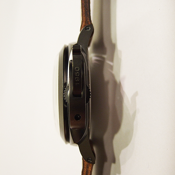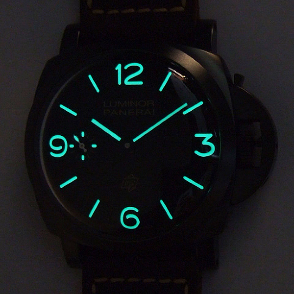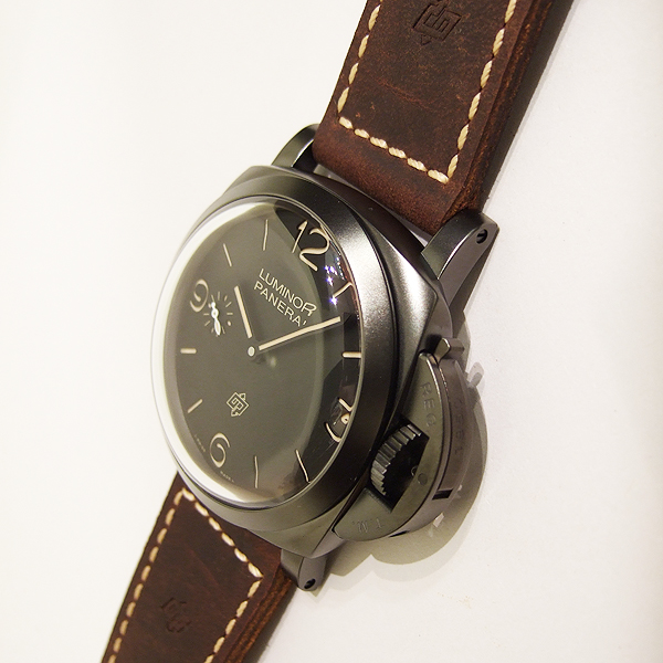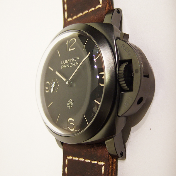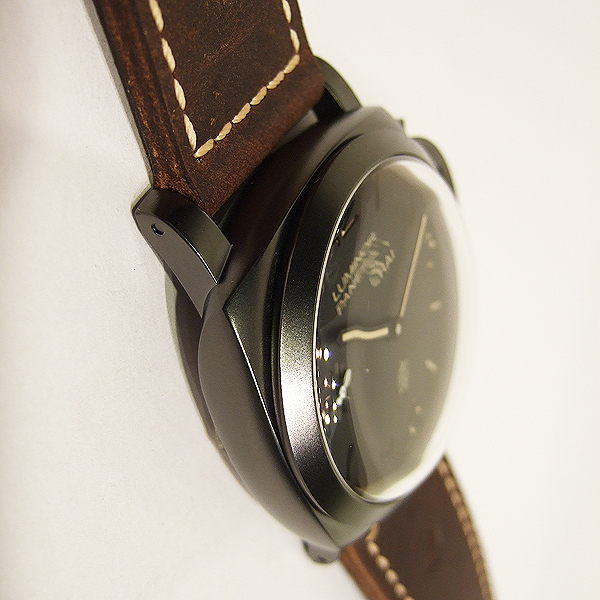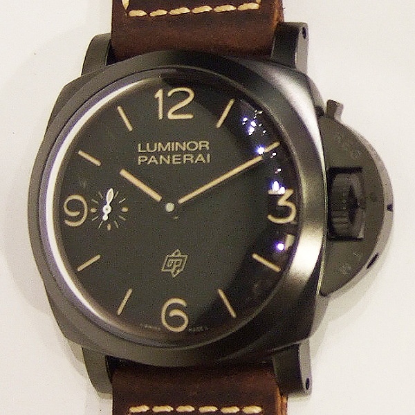 Luminor 1950 3 Day - 47mm 3日鏈腕錶/ 型號:PAM00617/ R 字頭限量製作300只/ 採自製編號:P.3000 手上鏈機芯, 厚:5.3mm,16 1/2法分, 21石, 2 個發條盒,Glucydur平衡擺輪,每小石震頻 21,600次,Incabloc防震裝置,完全由PANERAI研製/ 具時ˋ分ˋ指示/ 黑色面盤, 6 點方位 OP 創廠 LOGO / 舊化處理夜光指針及時標,具夜光效果/ 錶徑: 47 mm/ 鈦合金包覆 DLC 錶殼/ 大ㄇ型(普通型)鋼質扣頭/ 特殊專利龍頭護橋(上有REG. 及 T.M.字樣,側面有 1950 字樣)/ 金魚缸式圓弧形藍寶石玻璃/ 防水達100米/ 搭配原廠深咖啡色舊化處理牛皮錶帶(上刻印有 OP LOGO)及黑色橡膠錶帶各 1 條方便自行拆換. |