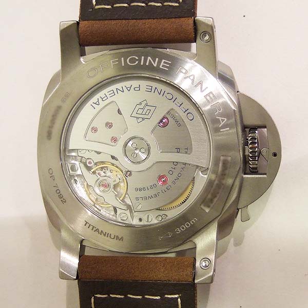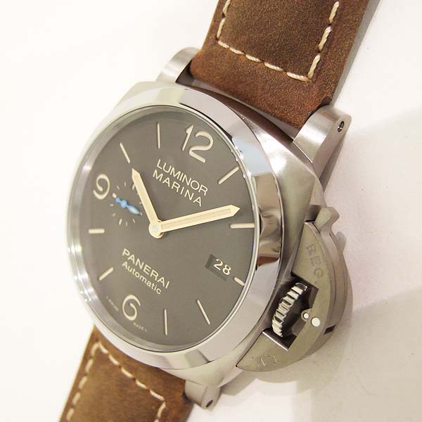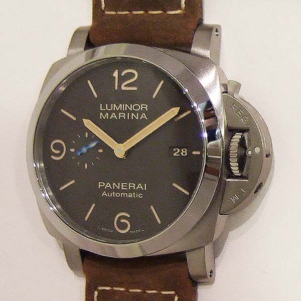 Luminor 1950 Marina 3 Day 自動腕錶/ 型號:PAM-01351/ T 字頭限量1000只(可快拆式錶帶)/ 採用Panerai P.9010 自動上鏈機芯/ 機芯為:13 3/4 法分ˋ 28石ˋ 每小時擺率 28800次ˋ Incabloc防震裝置ˋ 動力儲存 3 日/ 具時ˋ分ˋ小秒針ˋ日期顯示/ 錶殼拋光及霧鈦合金材質/ 菸草色錶面/ 夜光時標及指針/ 藍寶石水晶鏡面/ 防水達300米/ ㄇ型錶扣/ 附原廠咖啡色膠帶及棕色牛皮錶帶.