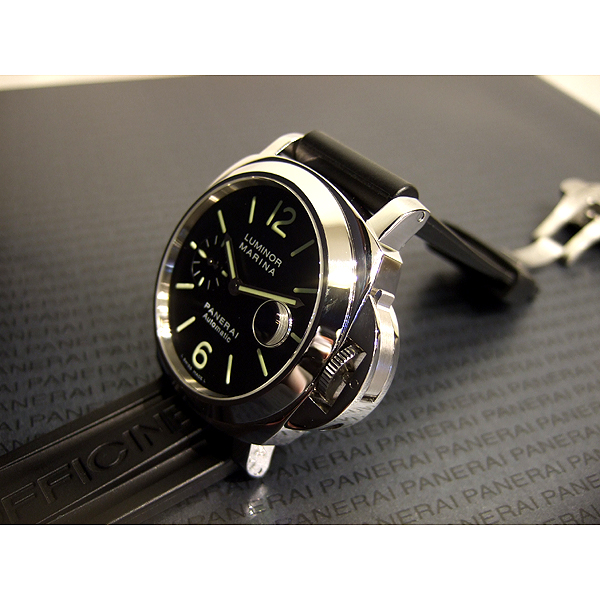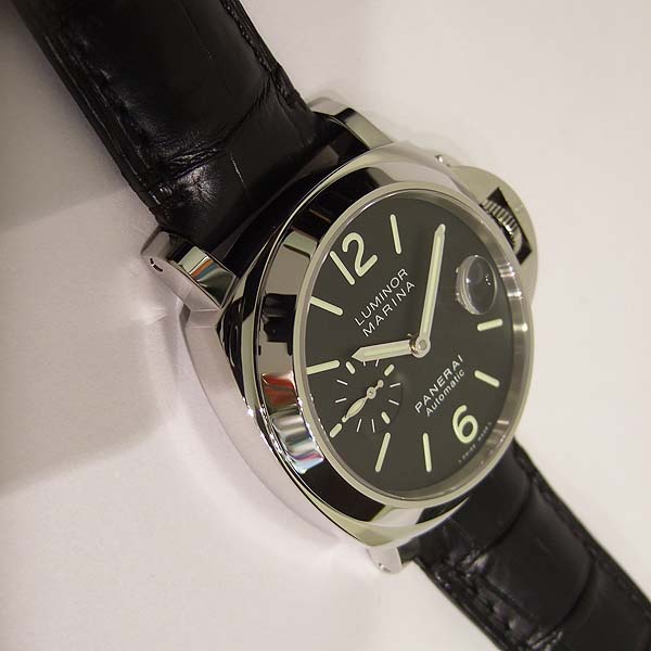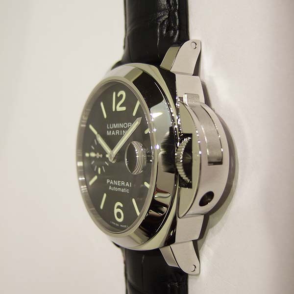 Luminor Marina Automatic Acciaio-44mm 自動腕錶/ 型號:PAM-00104/ N 字頭限量 3000 只/ 採用 Panerai OP III 自動上鏈機芯/ 機芯為:21石,每小時擺率 28800次,Incabloc 防震裝置 ,動力儲存約42 小時,獲天文台認證(C.O.S.C)/ 具時ˋ分ˋ小秒針指示及日期顯示/ 錶殼 44mm 316L 拋光鋼材質/ 黑色錶面/ 夜光指針及時標/ 藍寶石水晶鏡面/ 防水達300米/ 附黑色替代用牛皮壓鱷魚紋錶帶及原廠黑色橡膠表帶和折疊式錶扣. |
