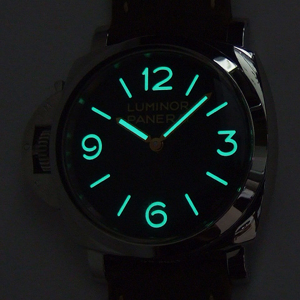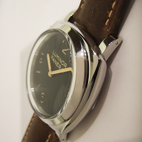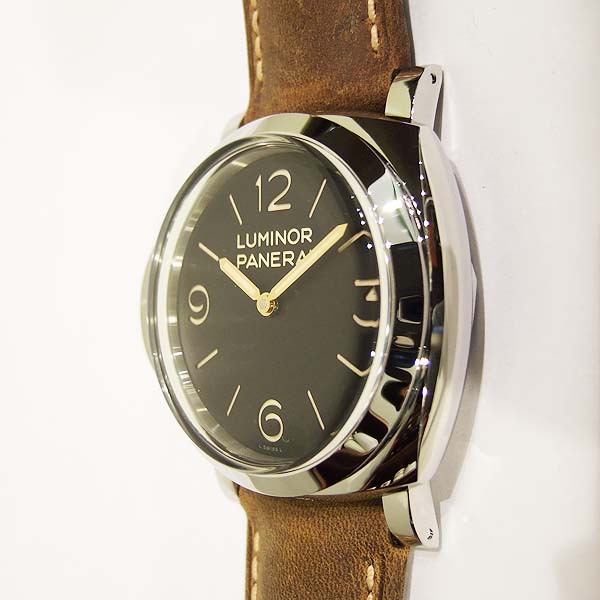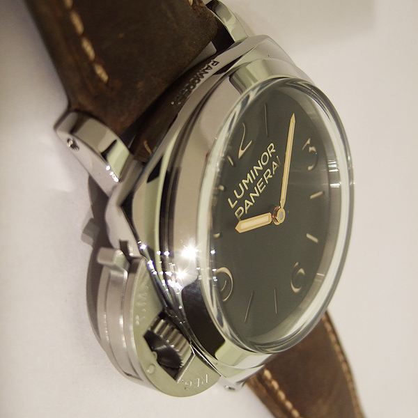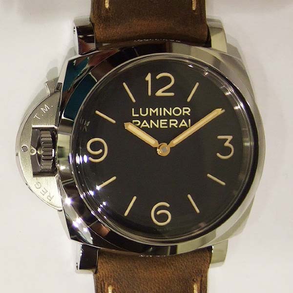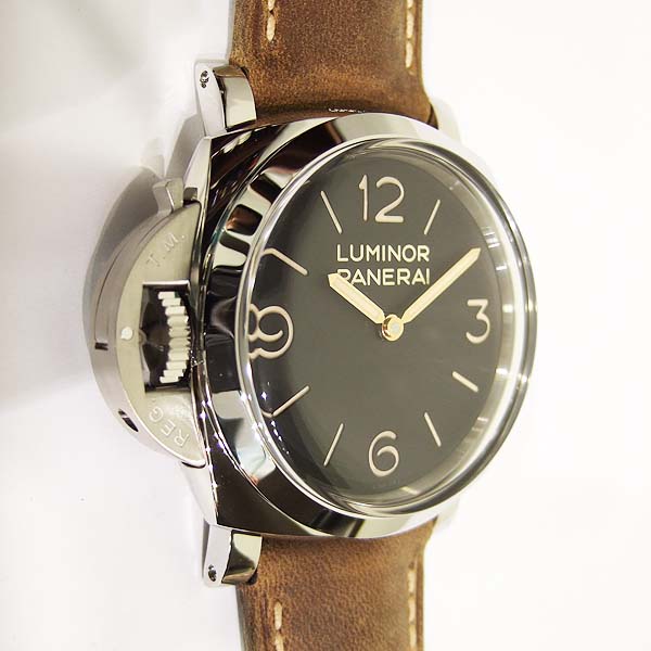 LUMINOR 1950 LEFT-HANDED 3 DAYS ACCIAIO - 47mm 3日鏈腕錶/ 型號:PAM00557/ Q 字頭限量製作 700 只/ 採自製編號:P.3000 手上鏈機芯, 厚:5.3mm,16 1/2法分, 21石, 2 個發條盒,Glucydur平衡擺輪,每小時震頻 21,600次,Incabloc防震裝置,完全由PANERAI研製/ 具時ˋ分ˋ指示/ 黑色面盤(三明治面盤)/ 夜光指針及時標/ 錶徑: 47 mm/ 精鋼拋亮及霧面錶殼/ 大ㄇ型(普通型)鋼質扣頭/ 特殊專利龍頭護橋(上有REG. 及 T.M.字樣)/ 金魚缸式圓弧形 Plexiglas 樹脂玻璃(厚度3毫米)/ 藍寶石水晶透明錶背/ 防水達100米/ 搭配原廠深咖啡色舊化處理牛皮錶帶 |