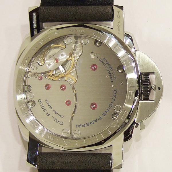 Luminor 1950 3 Day - 47mm FLRENZE 創始店限定版 3 日鏈腕錶/ 型號:PAM00605/ R 字頭限量製作 99 只/ 採自製編號:P.3000 手上鏈機芯, 厚:5.3mm,16 1/2法分, 21石, 2 個發條盒,Glucydur平衡擺輪,每小石震頻 21,600次,Incabloc防震裝置,完全由PANERAI研製/ 具時ˋ分ˋ指示/ 藍灰色金屬光色面盤(三明治面盤)/ 舊化夜光指針及時標/ 錶徑: 47 mm/ 精鋼拋亮及霧面錶殼/ 大ㄇ型(普通型)鋼質扣頭/ 特殊專利龍頭護橋(上有REG. 及 T.M.字樣)/ 藍寶石水晶鏡面及透明錶背/ 防水達100米/ 搭配替代用灰綠色舊化處理牛皮錶帶及原廠黑色橡膠錶帶.